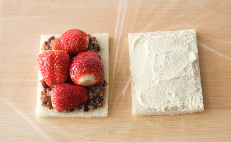 【2】食パンに発酵あんこを塗り、いちごを並べる。もう1枚の食パンに【1】のクリームを塗る。