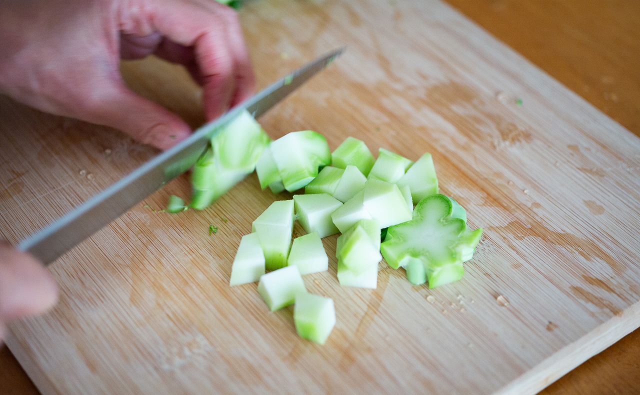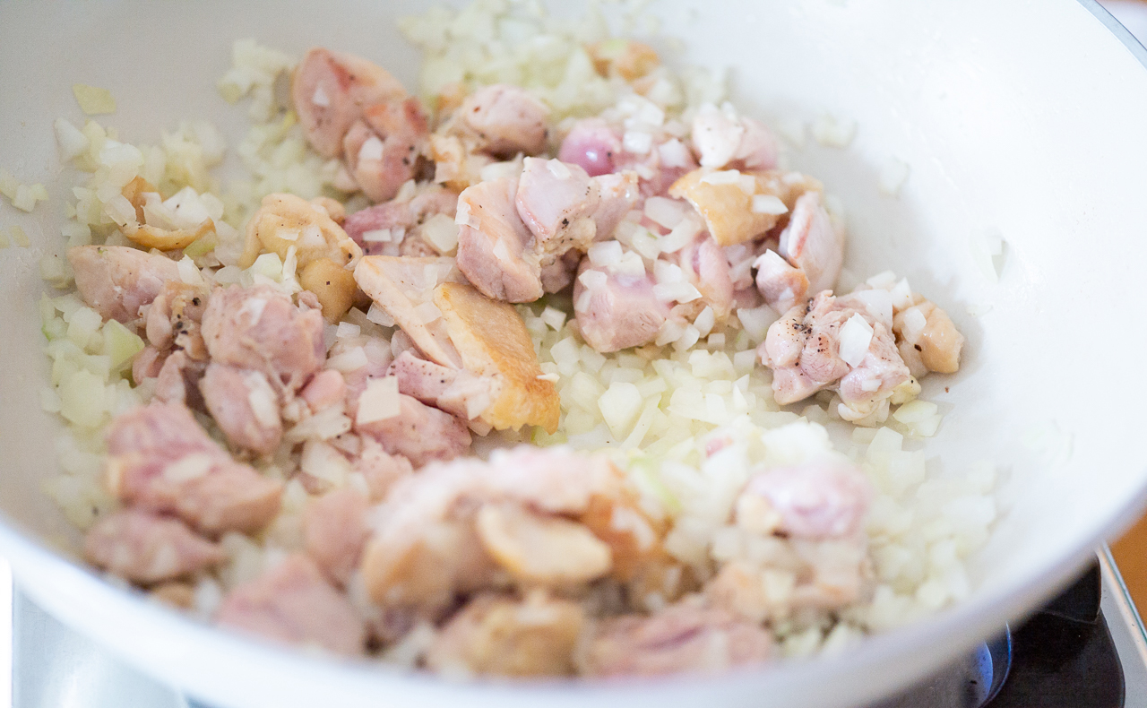 ブロッコリーとカリフラワーは、水を張ったボウルに逆さまに入れて15分ほど浸すと汚れが浮いてきます。ブロッコリーって茎が甘くておいしいんですよ。筋っぽいところを取り除く必要がありますが、ぜひスープに入れてみてください。鶏モモ肉は分量外の塩コショウで下味をつけて、タマネギとニンニクは粗みじん切りにしておきましょう!