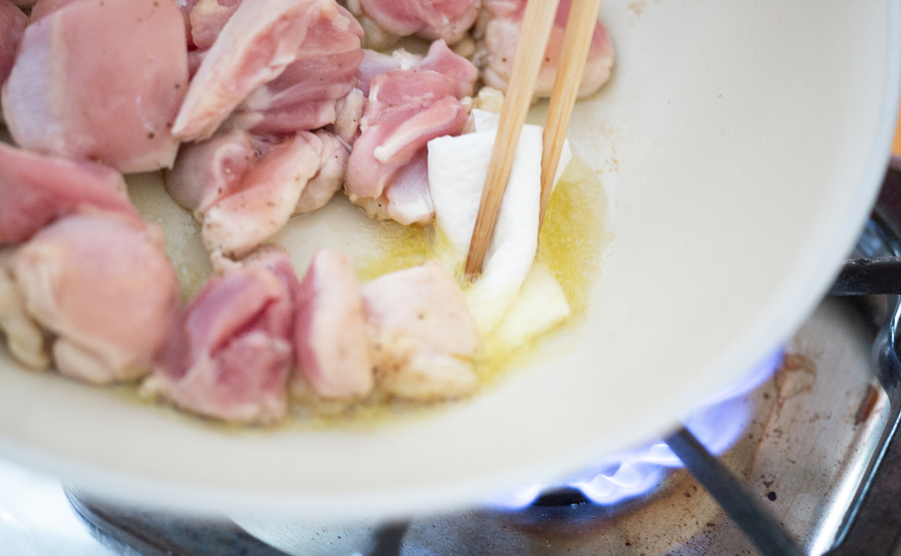 【2】 鍋を熱したら、鶏モモ肉の皮目を下にしてゆっくり焼く。溶け出した脂をペーパーで軽く拭き取る。