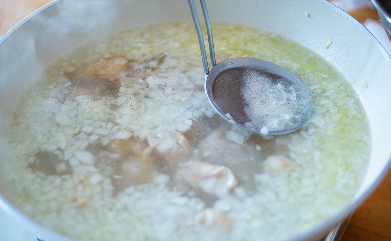 【3】 タマネギとニンニクを加えて軽く炒め、水と白ワイン(または酒)を注ぎ、煮立ったら弱めの中火にし、アクをひく。