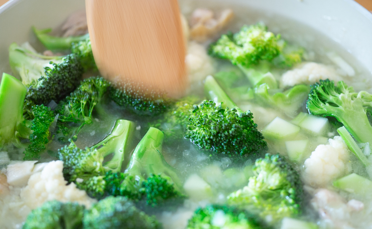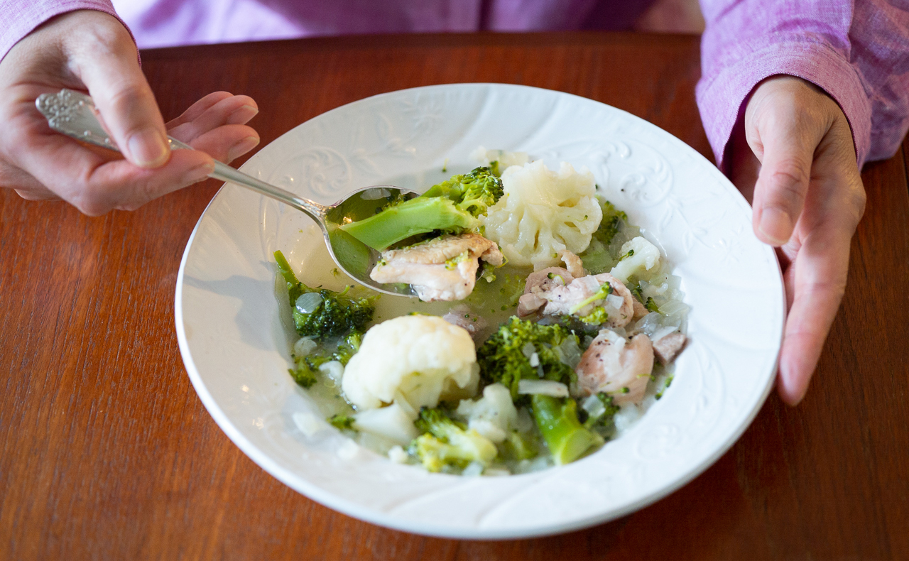 香ばしい鶏肉と野菜の甘みがぎゅっと詰まった「ブロッコリーとカリフラワーのスープ」。ご本人に召し上がっていただきましょう!