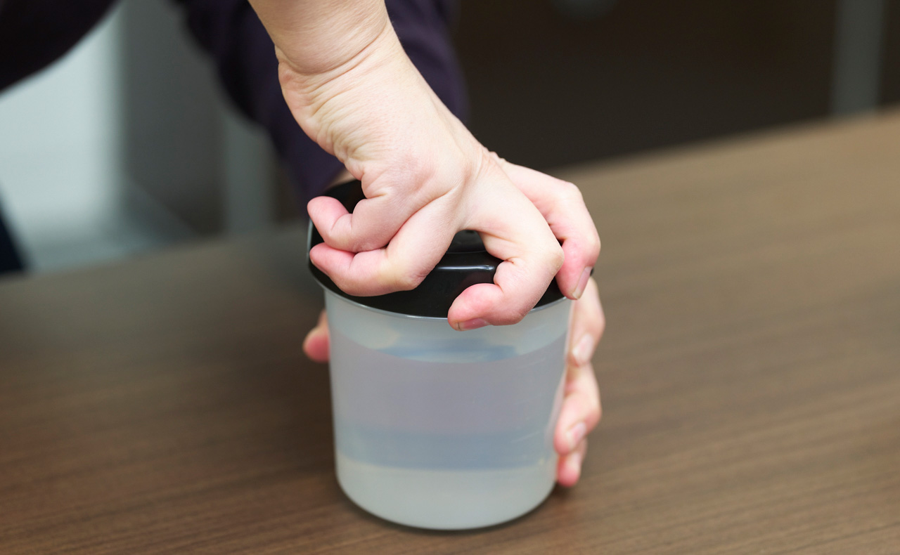 「ふふふ。『どこにあるの?』と思っていただけるくらい、本当に小さな工夫なんです。一見、普通の商品と変わらない見た目なんですが、この溝があるだけでしっかりと減圧対策ができるんですよ。言葉だけじゃ納得していただけないかもしれないと思って、今日はフタに溝があるもの、ないものの2つの容器を中身入りで持ってきました。それぞれ開けてみてください」