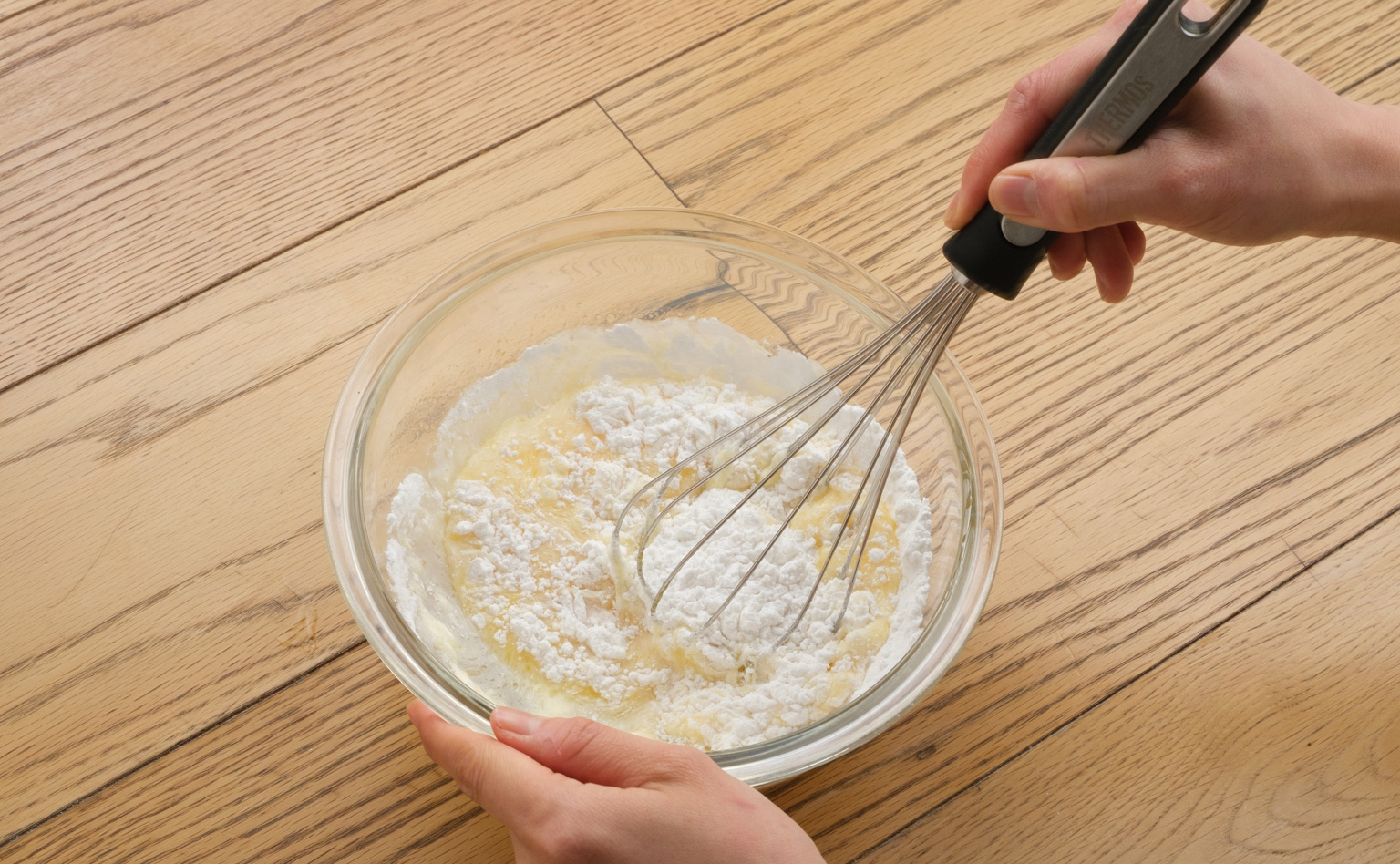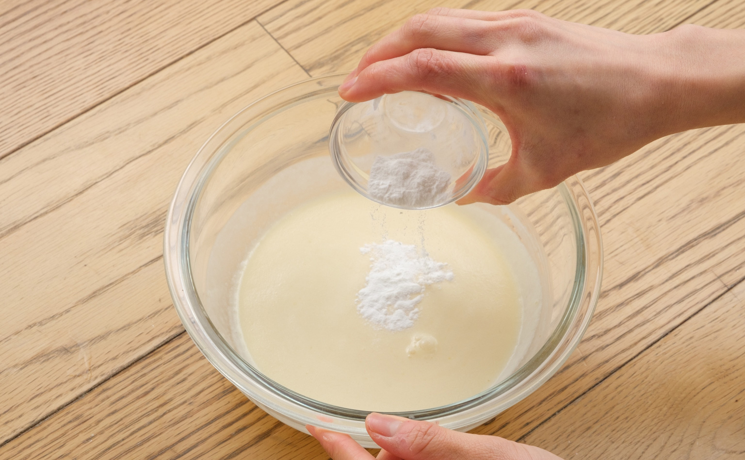 【2】【1】に米粉、牛乳、溶かしたバター、バニラエッセンスを入れて混ぜ、なめらかになったらベーキングパウダーを加えて混ぜる。
