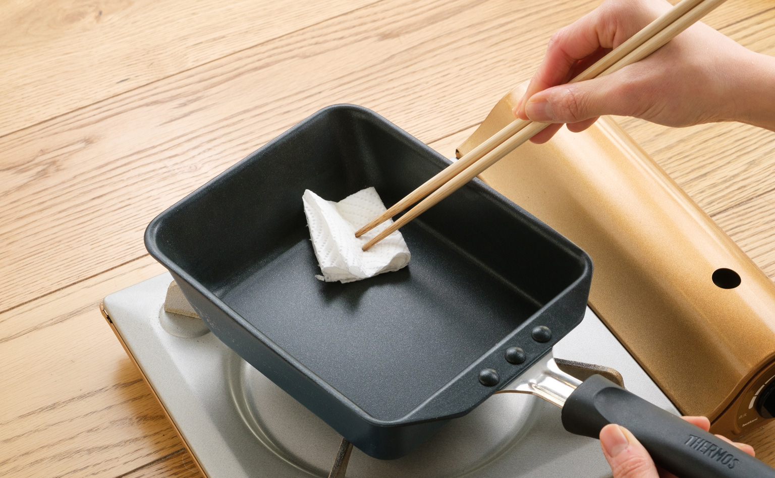 【3】玉子焼きフライパンを中火で温め、キッチンペーパーにしみこませた油を軽くひく。いったん火をとめて30秒ほど置き、熱を均一になじませる。