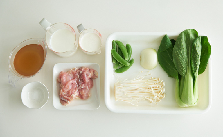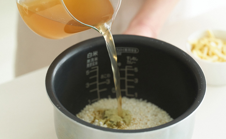 しょうがご飯にも、クリームソースにもベジブロスを使います。ベジブロスを使うと、コンソメスープよりやさしく深い味わいが楽しめますよ。