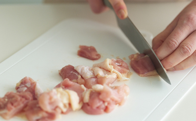 【1】 やわらか液に漬けておいた鶏もも肉を、一口大に切る。