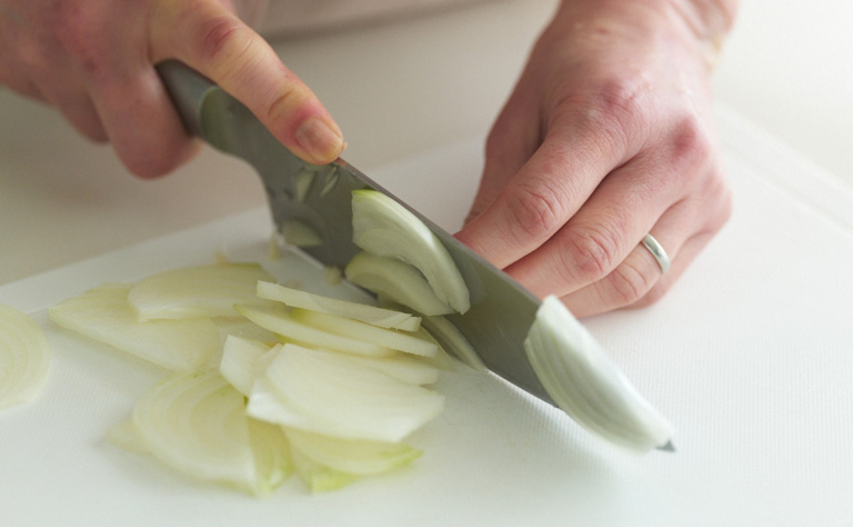 【2】 玉ねぎは薄切りに、えのきだけは適当な大きさに切る。チンゲン菜はざく切りにし、葉と根本の部分に分けておく。