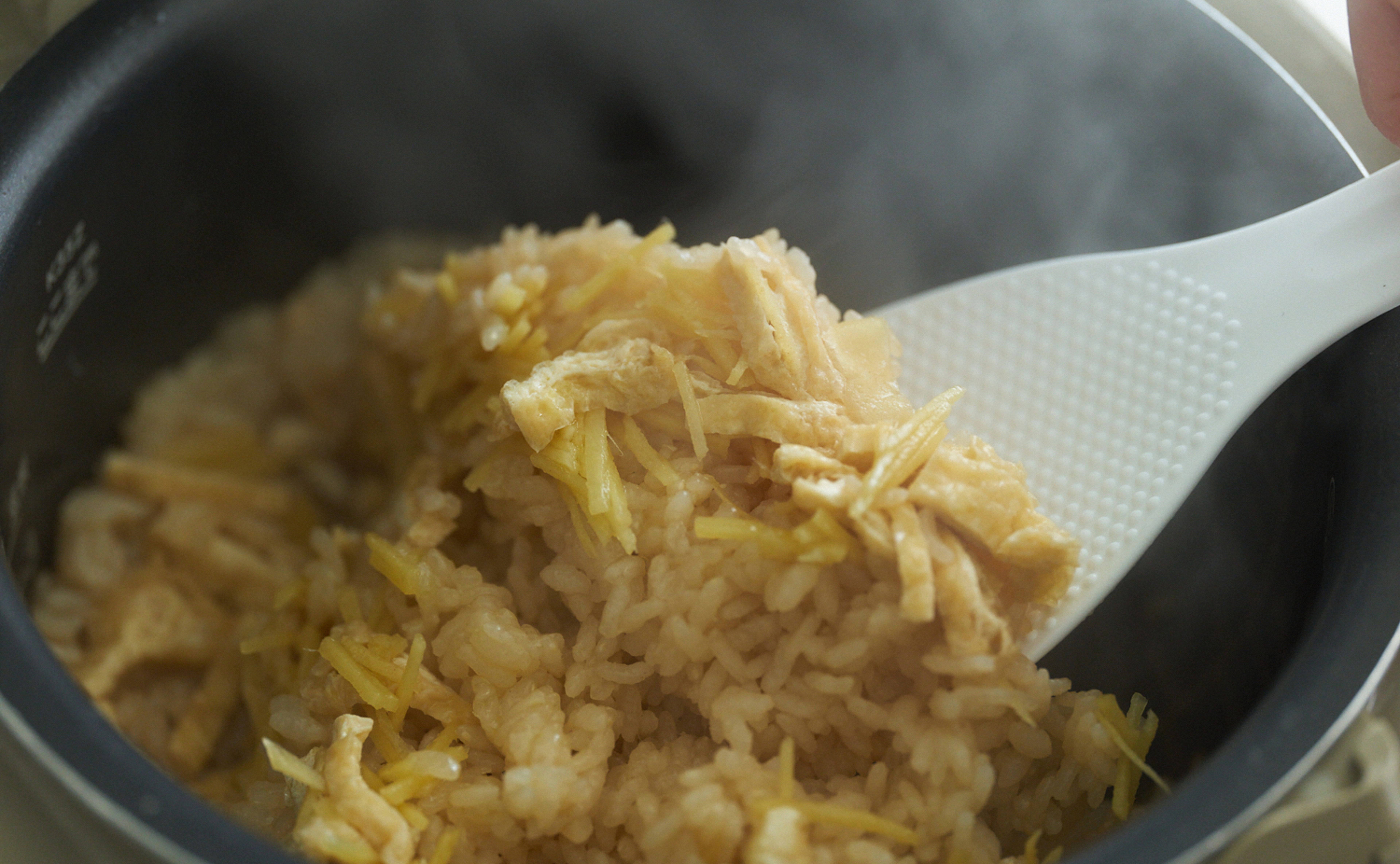 【3】 油揚げとしょうがを上に乗せたら、オリーブオイルを回し入れ、早炊きモードで炊飯する。