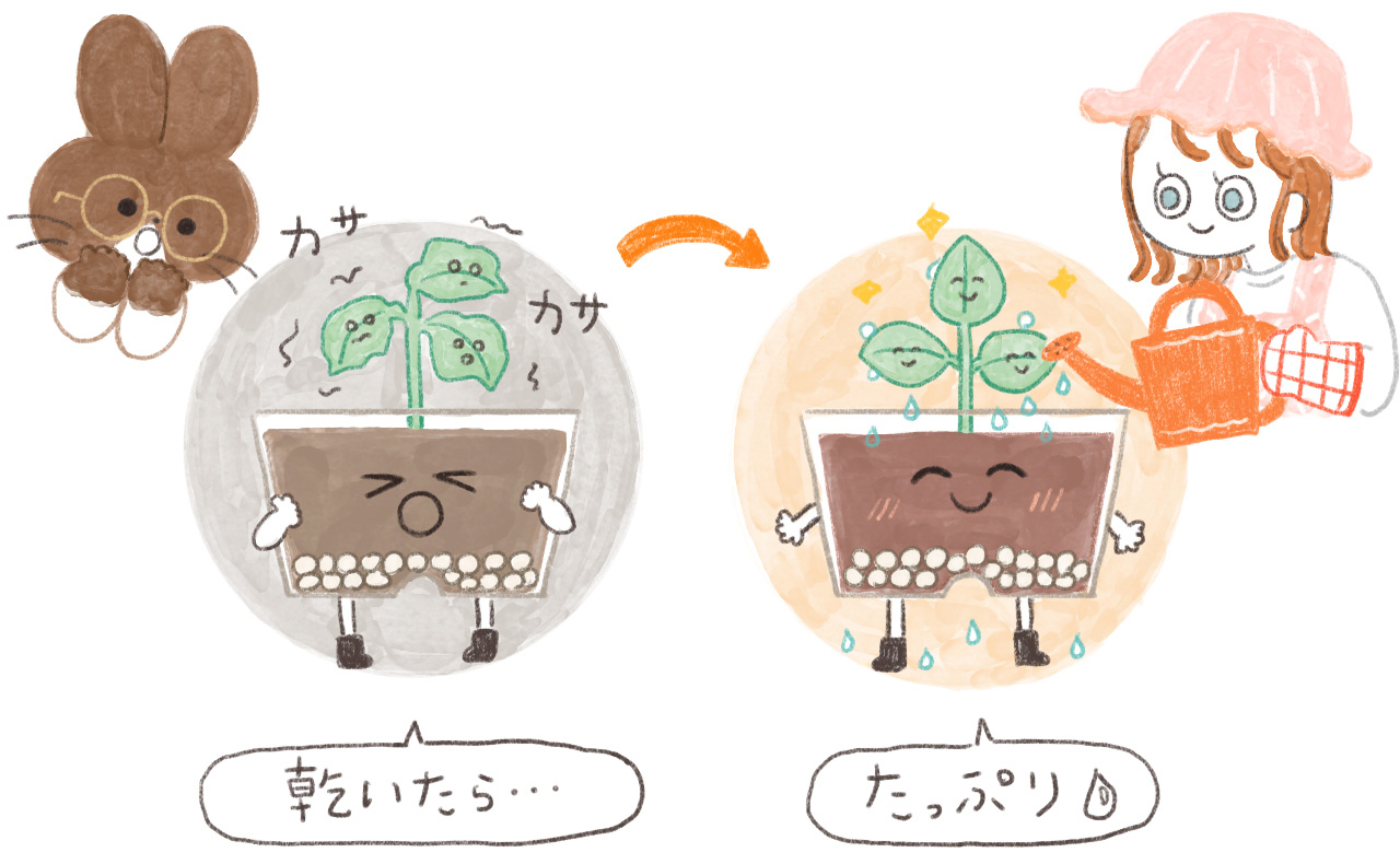 水やりのポイントは「乾いたら、たっぷりとあげる」。鉢の下から水が溢れるくらい、たっぷりあげるとよいでしょう。これをしっかり守ることが、ハーブを健やかに育てていくための肝になります。