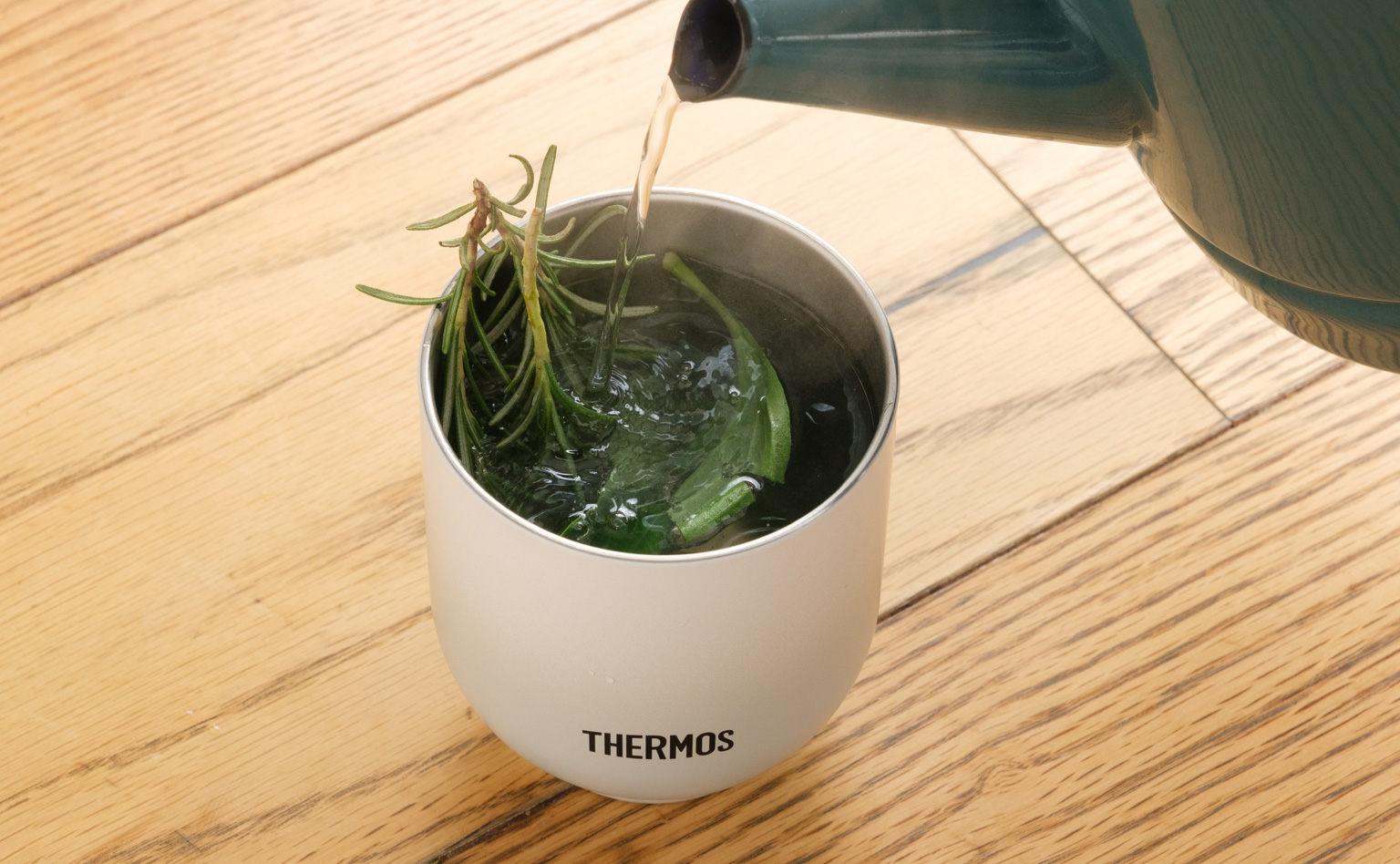 はい! ではローズマリーとバジルで作ってみましょうか。ハーブは洗って水気を切っておきましょう。ローズマリーは叩くだけでも香りが出ますよ。カップに入れたら熱湯を注いで、そのまま3分待つだけです。ハーブは飲む前に取り出してくださいね。