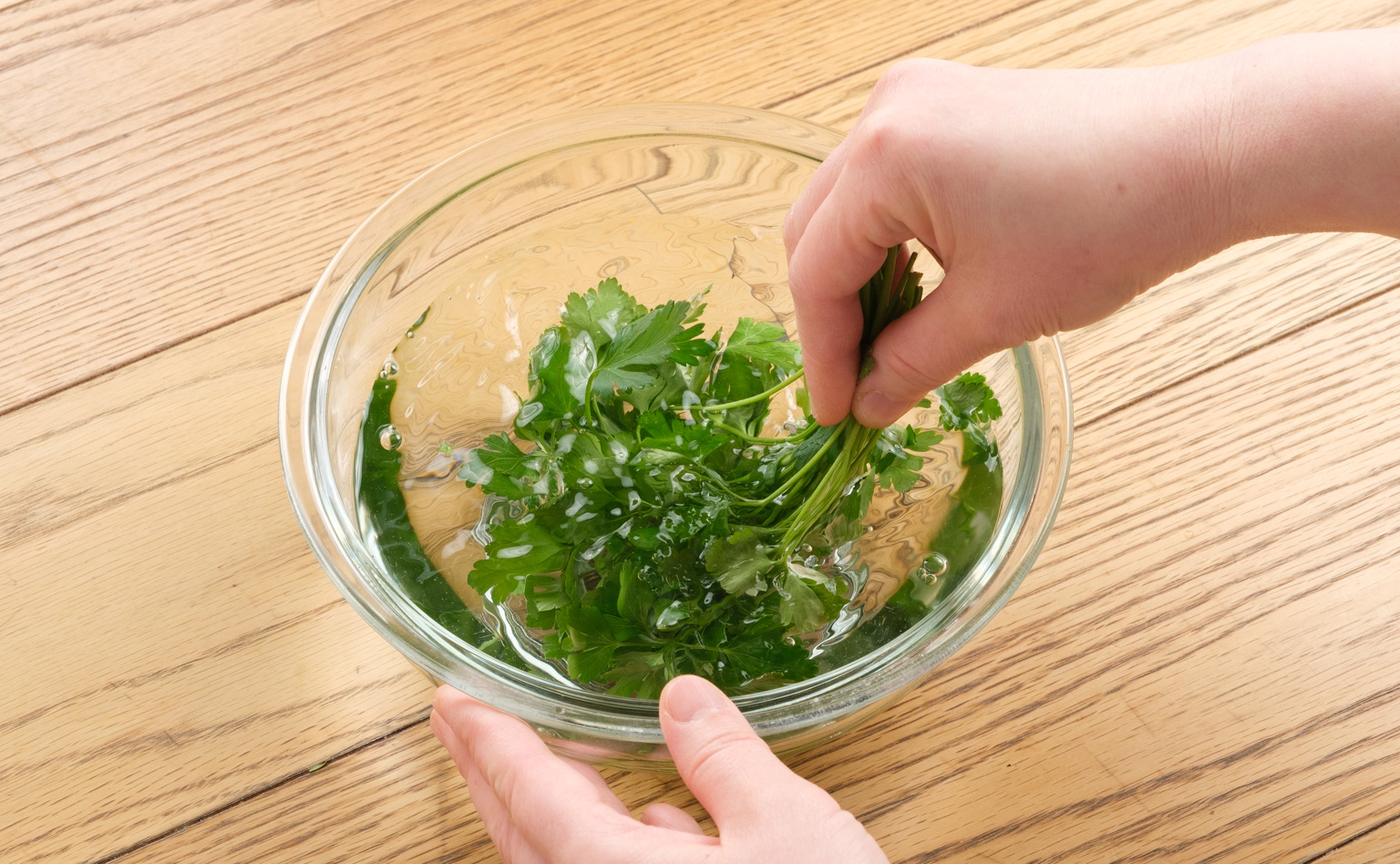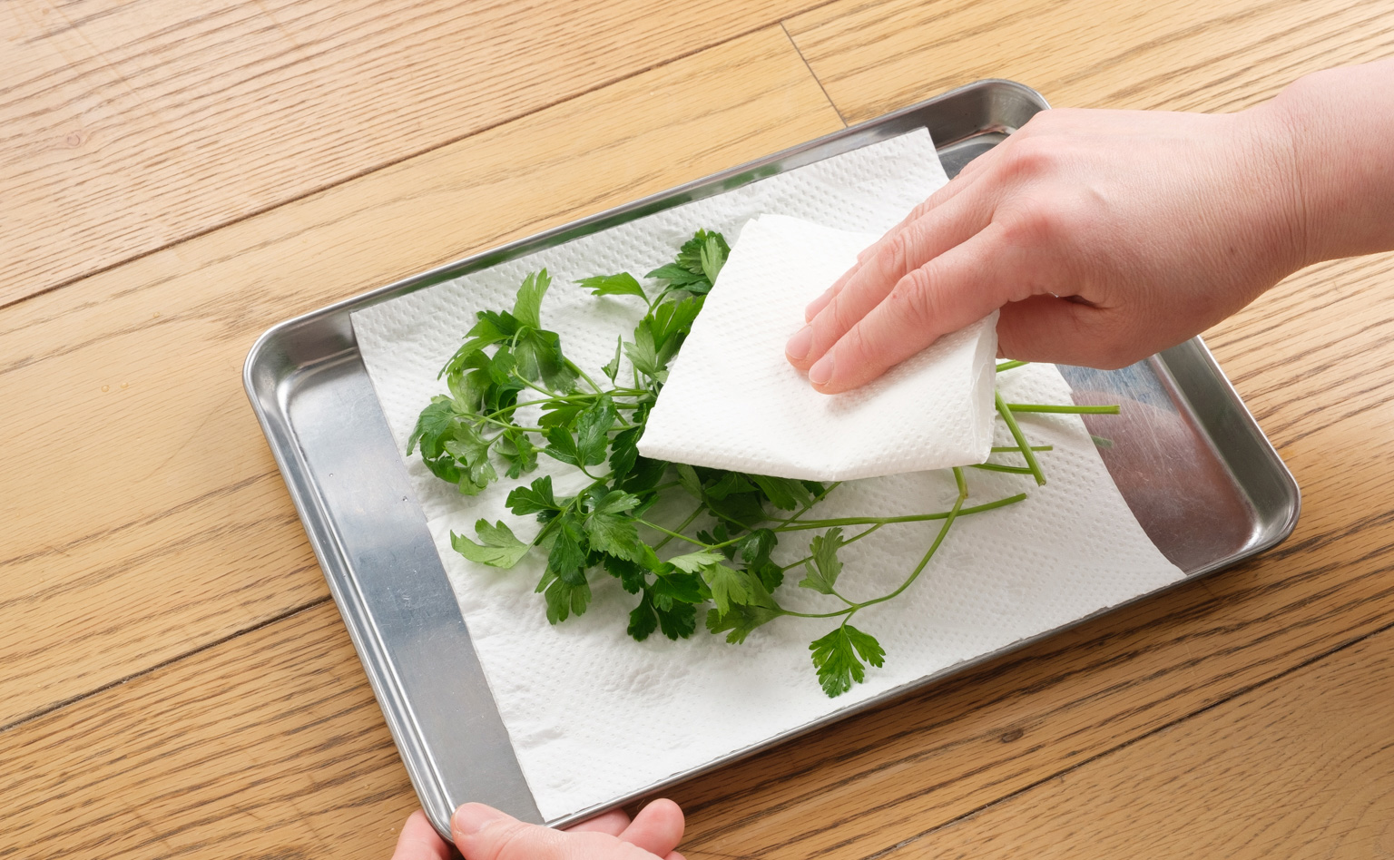 ハーブは傷つけないこと、そして適度な水気がポイントです。ではイタリアンパセリで実践してみましょう。