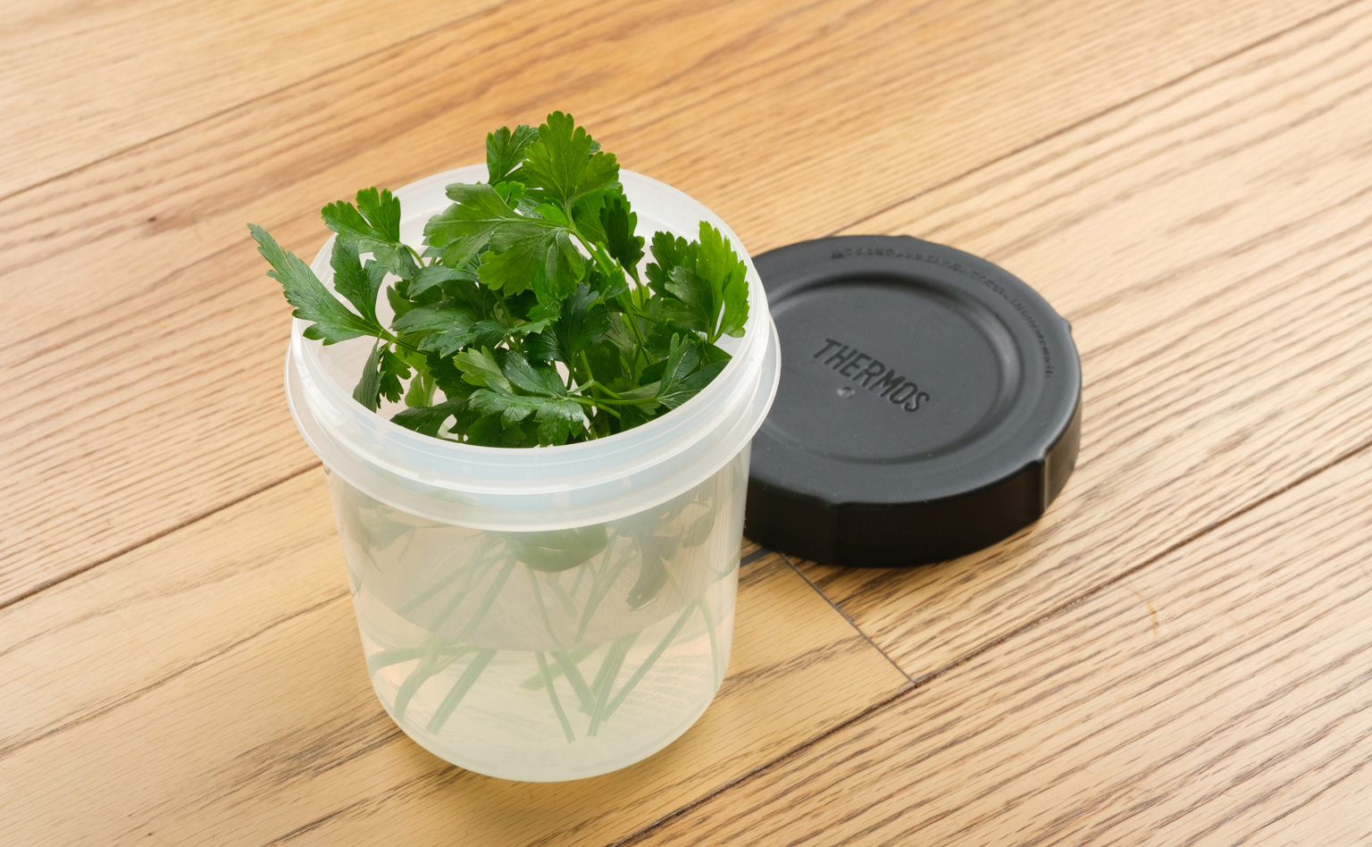 少ししおれていても、根元を切って水を吸わせる「水あげ」という作業をすると元気になります。その後、濡らしたペーパーを巻き付けてラップを巻き、袋に入れてから、野菜室ではなく冷蔵庫で保存しましょう。フードコンテナーならこのままフタをして保存するだけでOKです。