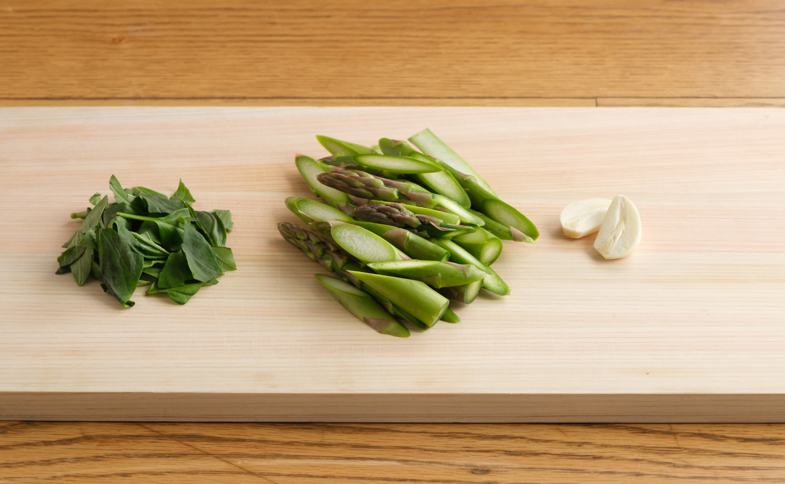 ・アスパラガスは根元を切り落とし斜めに切り、バジルはちぎる。