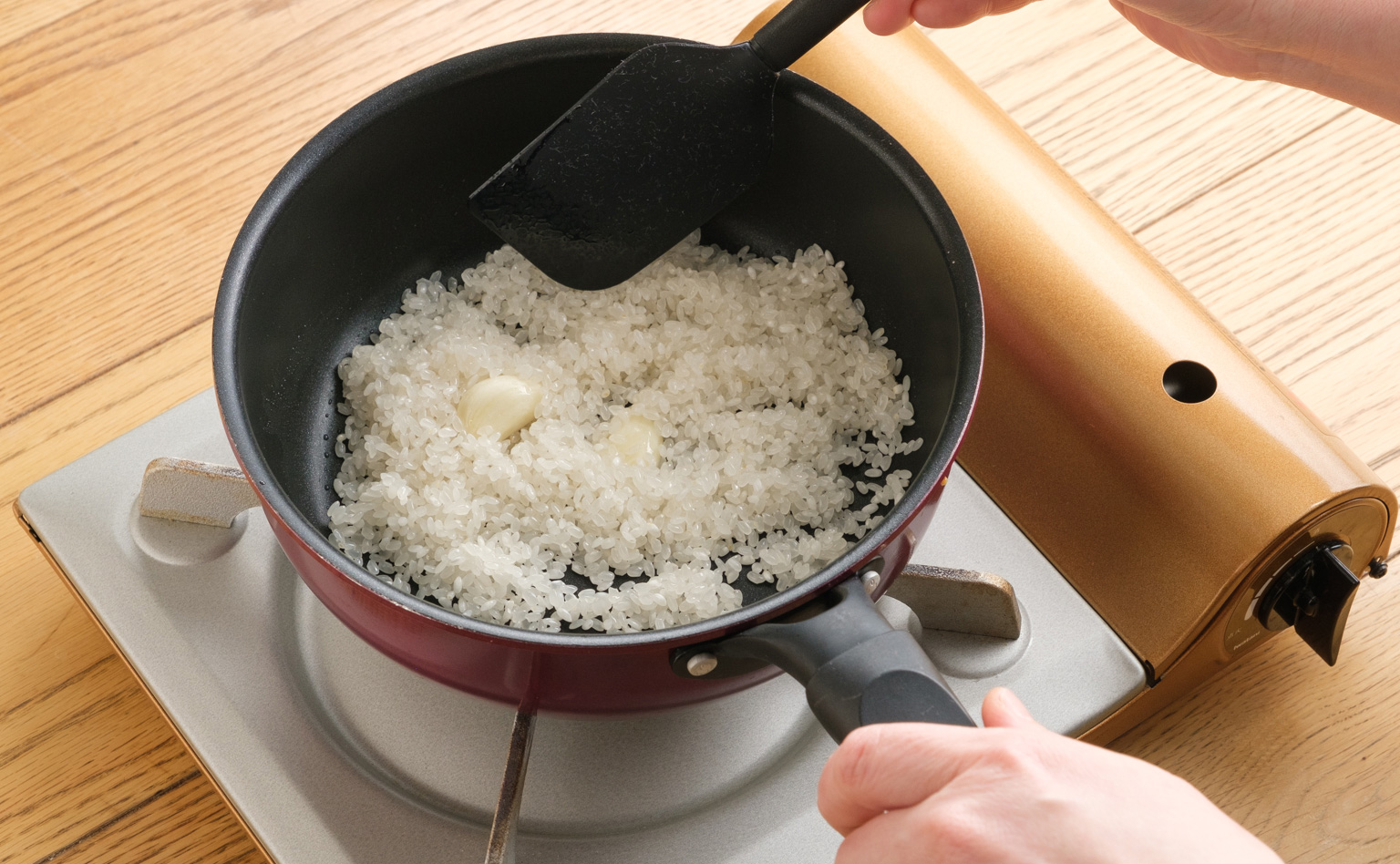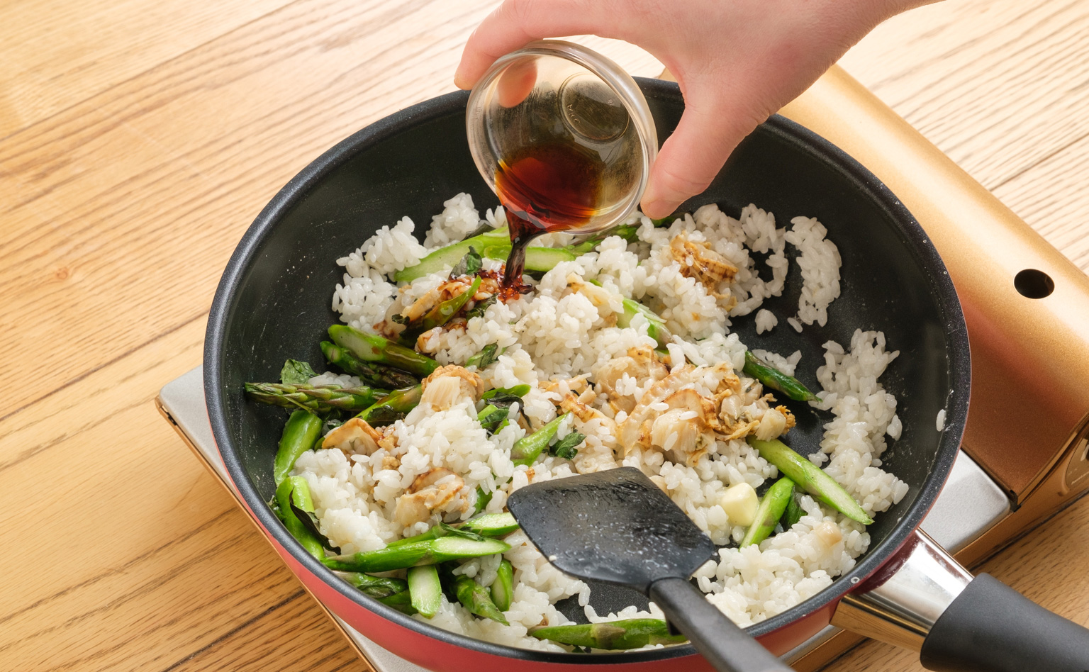 炒めたときの軽い焦げやえぐみをお米に移さないよう、炊くときはフライパンを分けるのがコツです。最初に使ったフライパンは洗わなくて大丈夫。後でアスパラガスを炒めるのに使います。