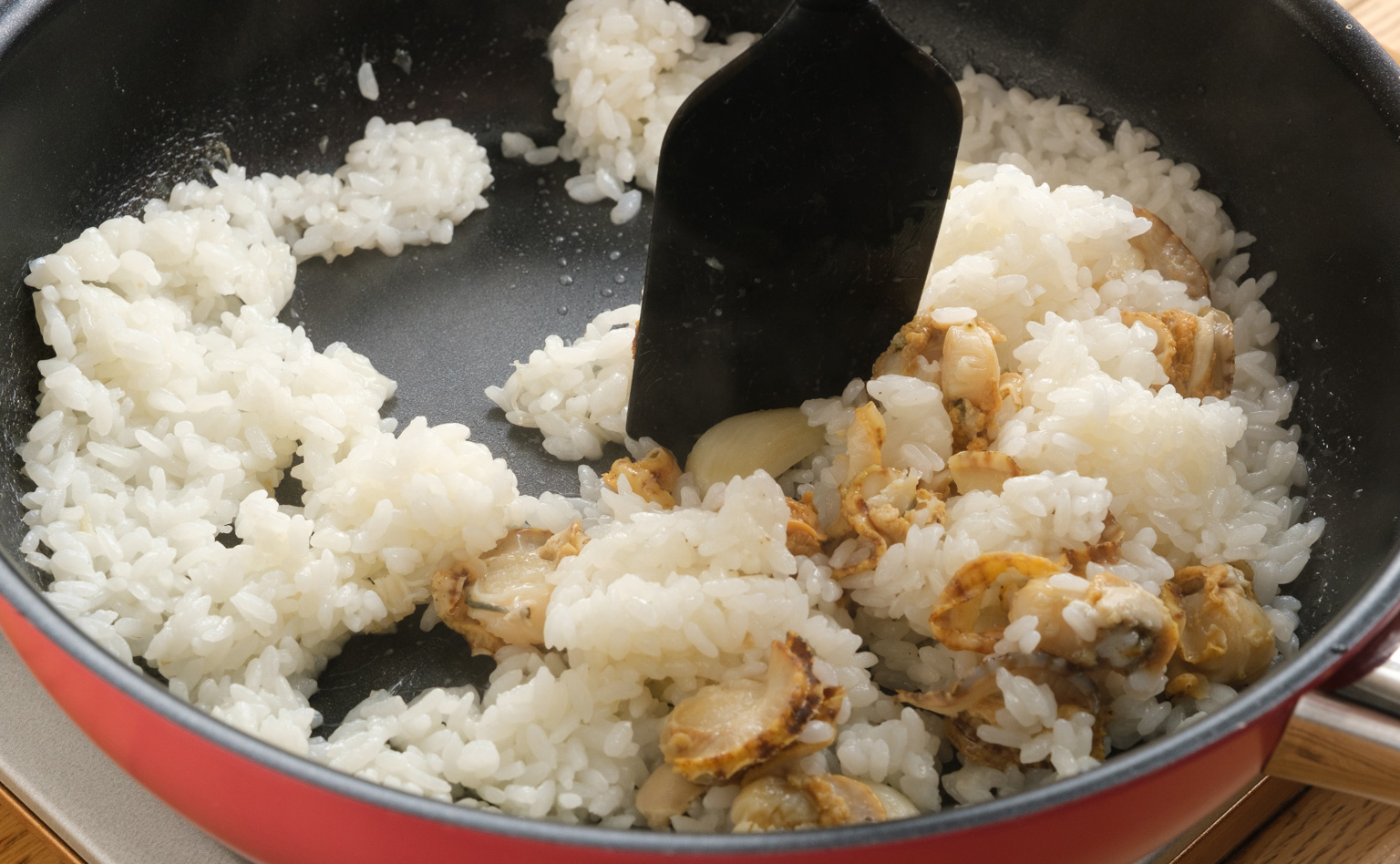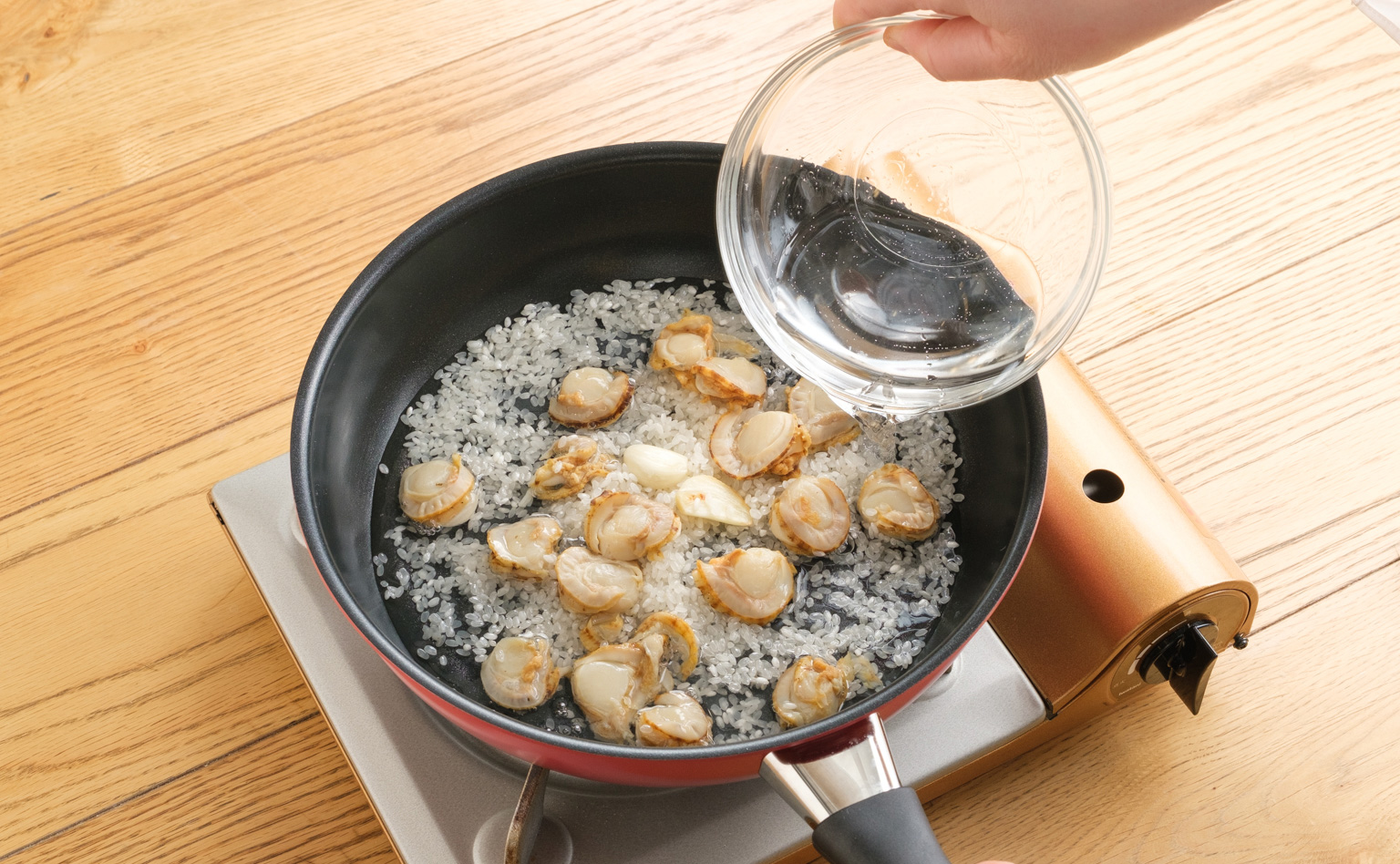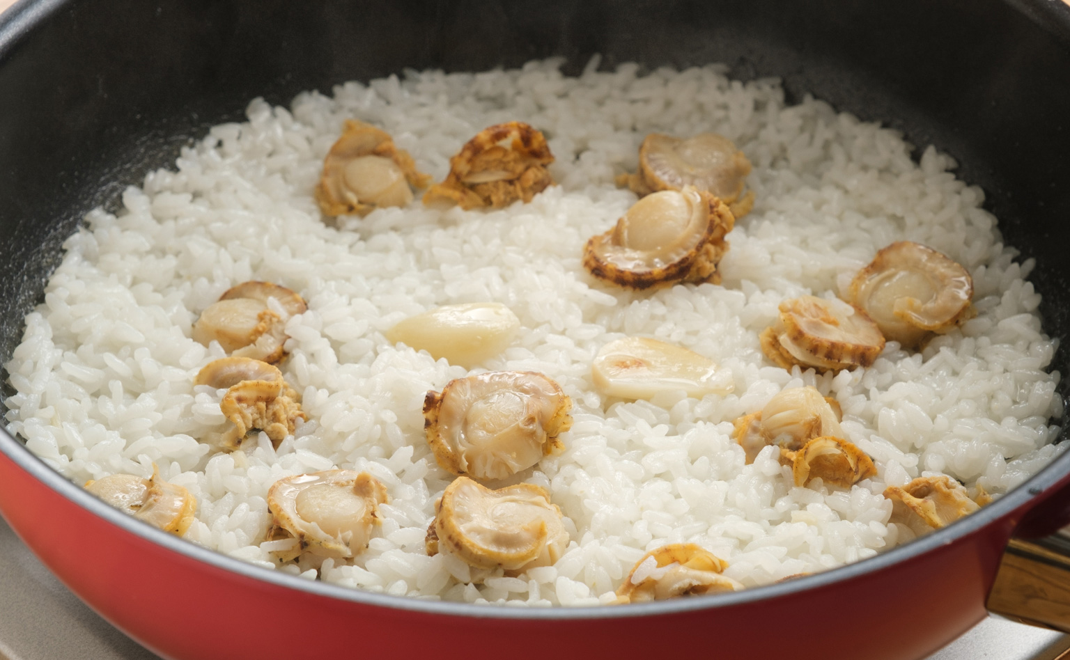 【1】小さめのフライパンに【A】を入れ、にんにくの香りがしたら米(無洗米)を入れて中火で軽く炒める。米に油が回ったら火を止め、別のフライパンにうつし水とボイルホタテを加える。フタをして強火にかける。沸騰したら弱火にして10分加熱する。火を止めそのまま10分蒸らす。
