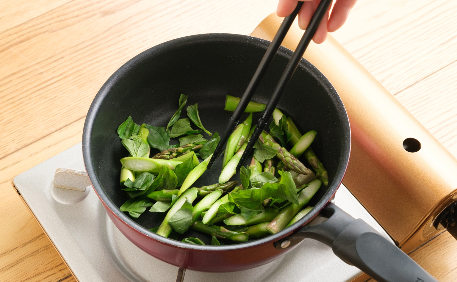 【2】アスパラガスを【1】のフライパンに入れ2分炒める。バジルを入れたら火を止め、余熱で炒めながら塩・こしょうをふる。
