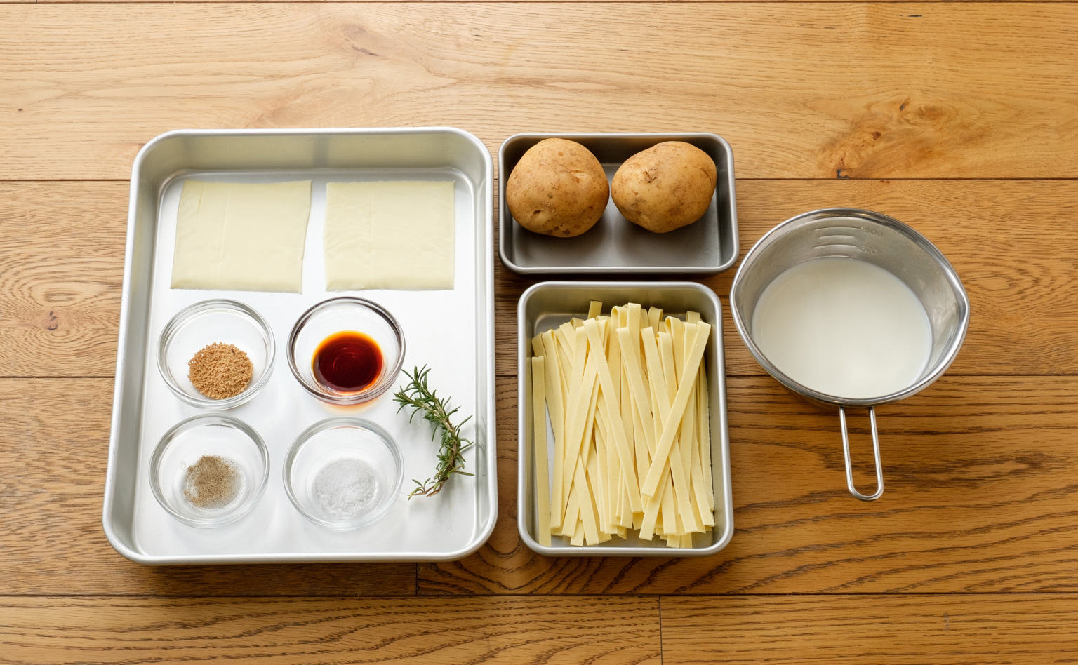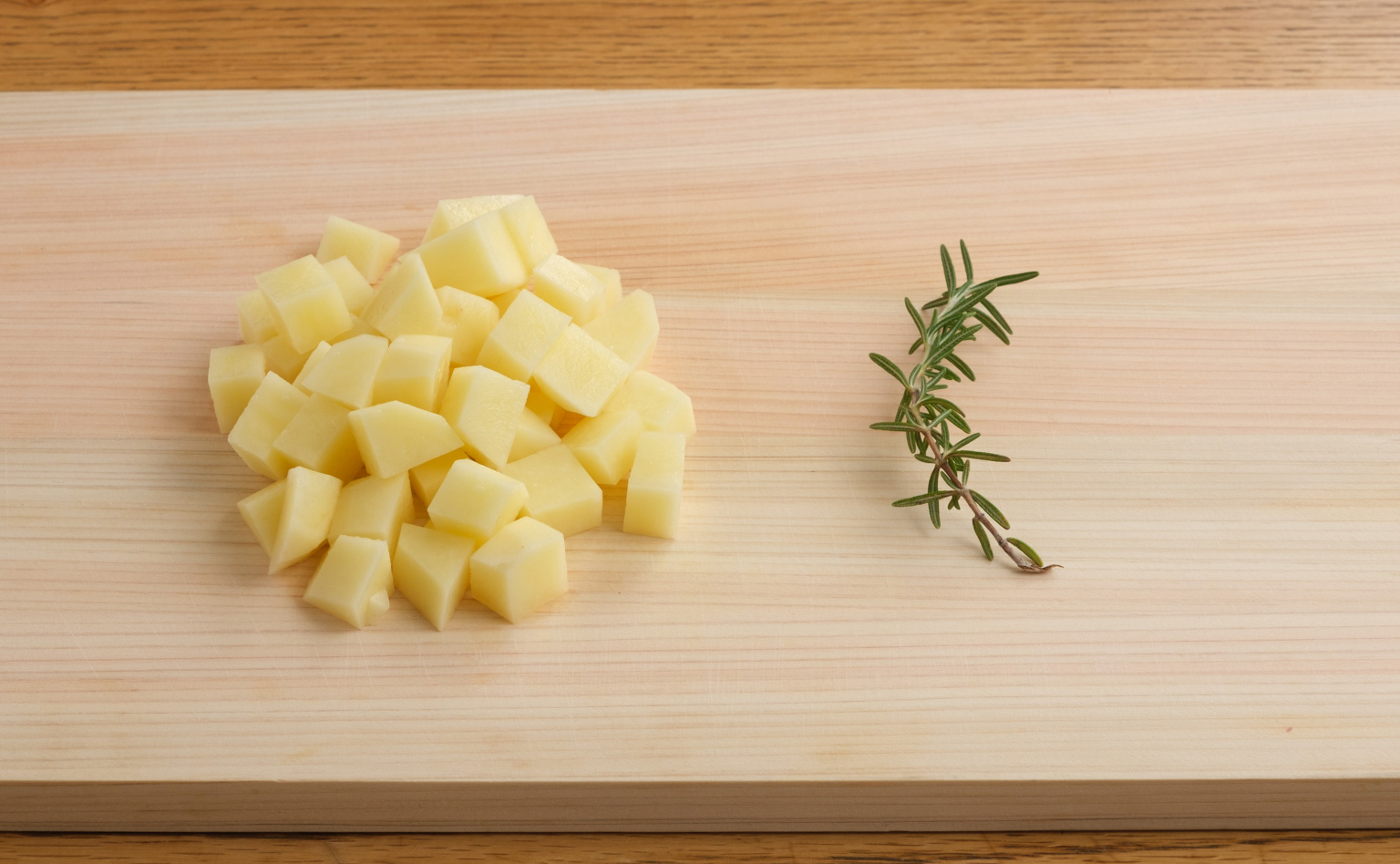 野菜にハーブの香りを付けるのは、私が以前勤めていたビストロなどでもよくやっていた方法なんです。じゃがいもとローズマリーは相性抜群。今回は新じゃがを使用しましたが、 通年で手に入るじゃがいもでも美味しく作れます。