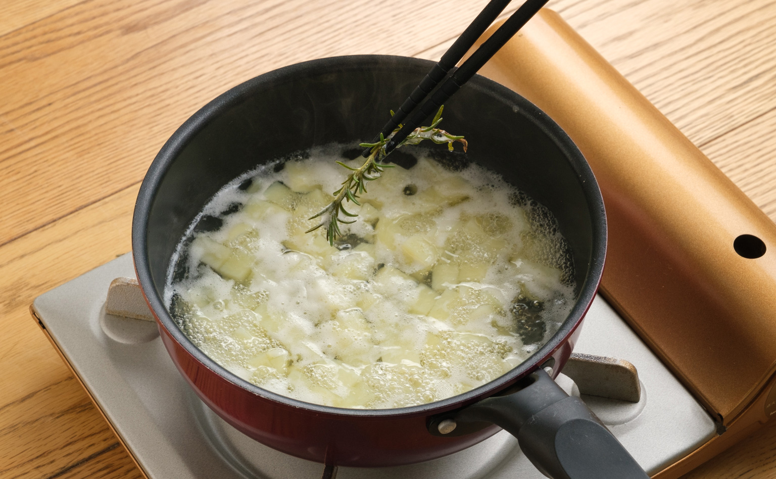 じゃがいもに香りと精油成分をうつすため、ローズマリーも一緒に茹でます。ただ茹ですぎるとえぐみが出てしまうので、途中で取り出してくださいね。