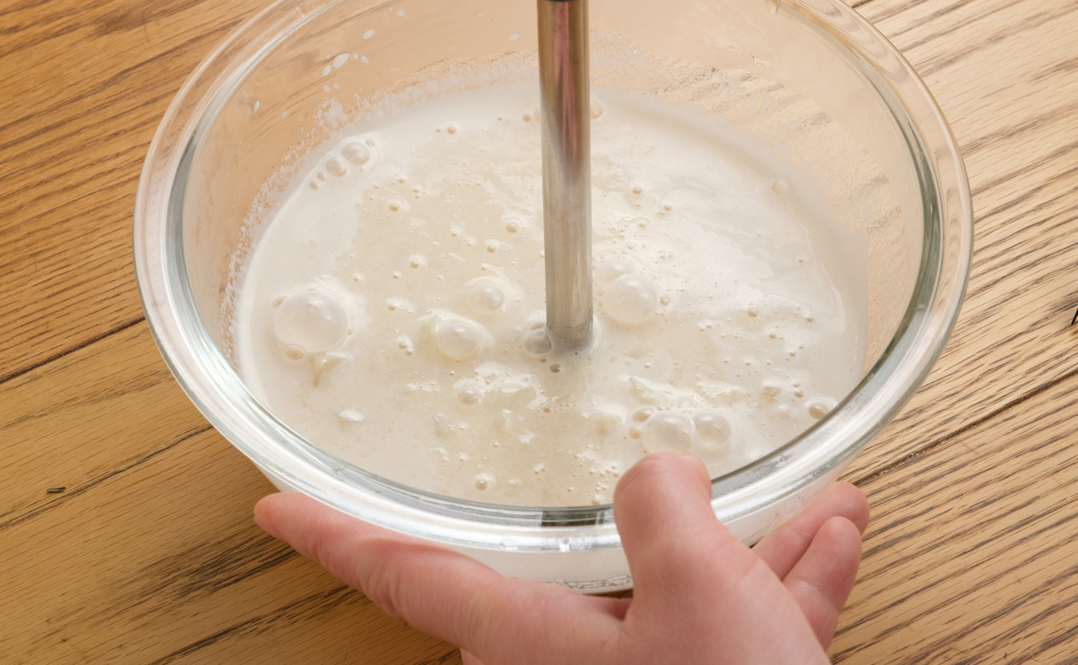 ザルにあけ、ボウルに入れ【A】を加え、ハンドブレンダーなどで攪拌する。