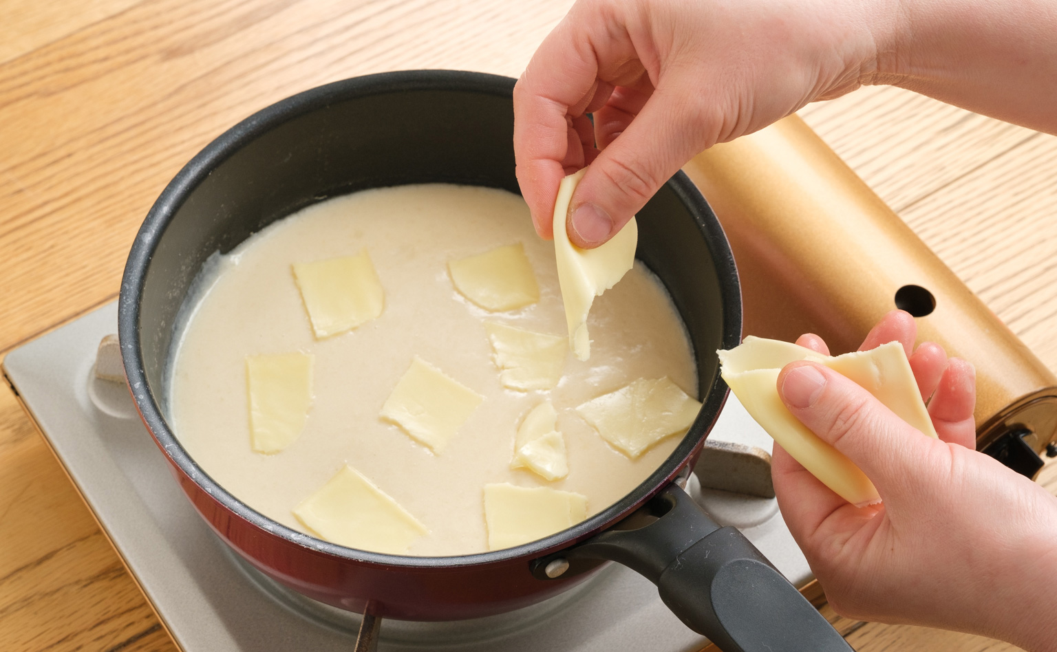 【2】再び鍋に戻し、弱火で温める。スライスチーズをちぎり入れて混ぜ、塩・こしょうで味を調える。