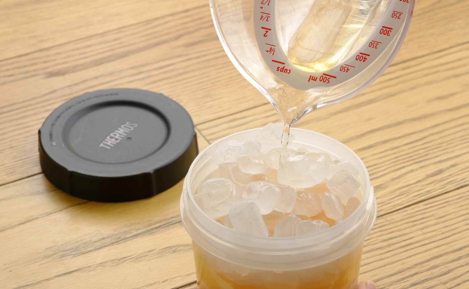 お酢を静かに注いだら、フタをして冷蔵庫で保存しましょう。氷砂糖が溶けたら飲み頃です。