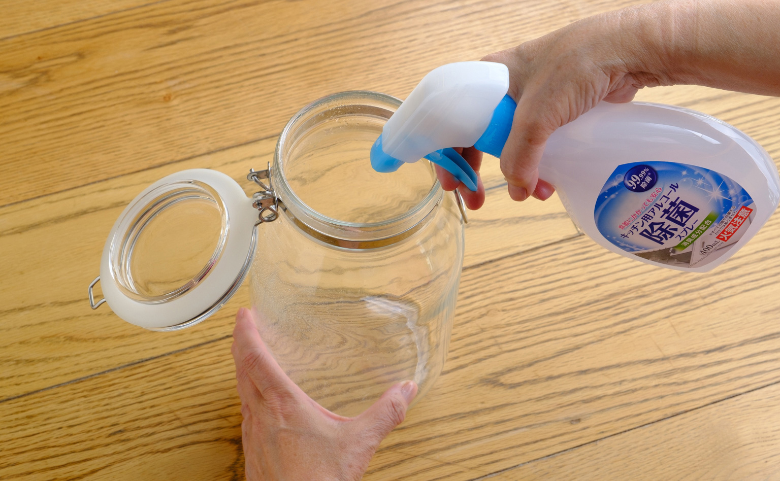 ・保存容器は食品にも使えるアルコールスプレーで消毒しておく。