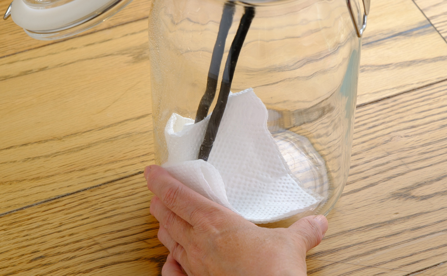 カビを出さない、雑菌を繁殖させないために、きちんと消毒することが大切です。食品にかかっても安心なアルコールスプレーを吹き付け、キッチンペーパーでしっかり拭き取ります。アルコールスプレーの代わりに度数の高いホワイトリカーでもOKです。