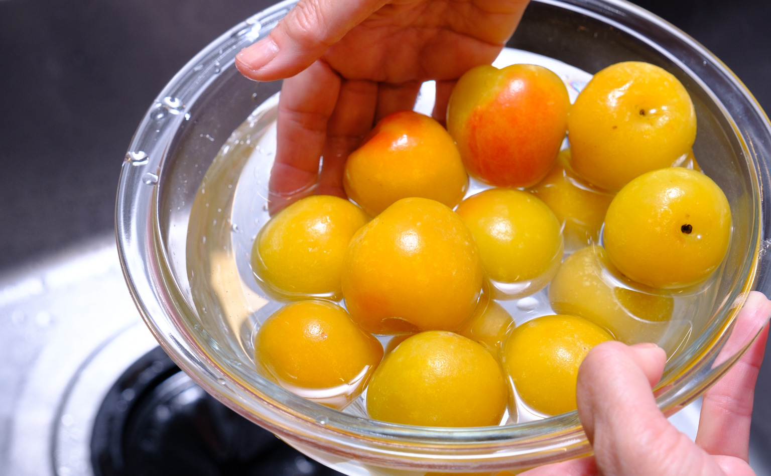 冷凍梅は解凍しなくて大丈夫。表面についた氷を溶かすことで後の作業がしやすくなります。梅に水分がついたままだと腐りやすくなるため、キッチンペーパーなどで優しく拭き取ってください。