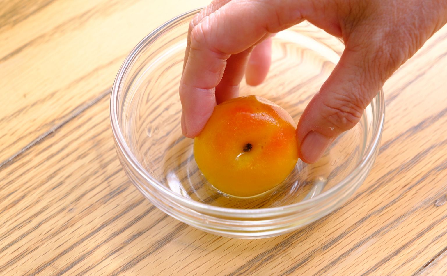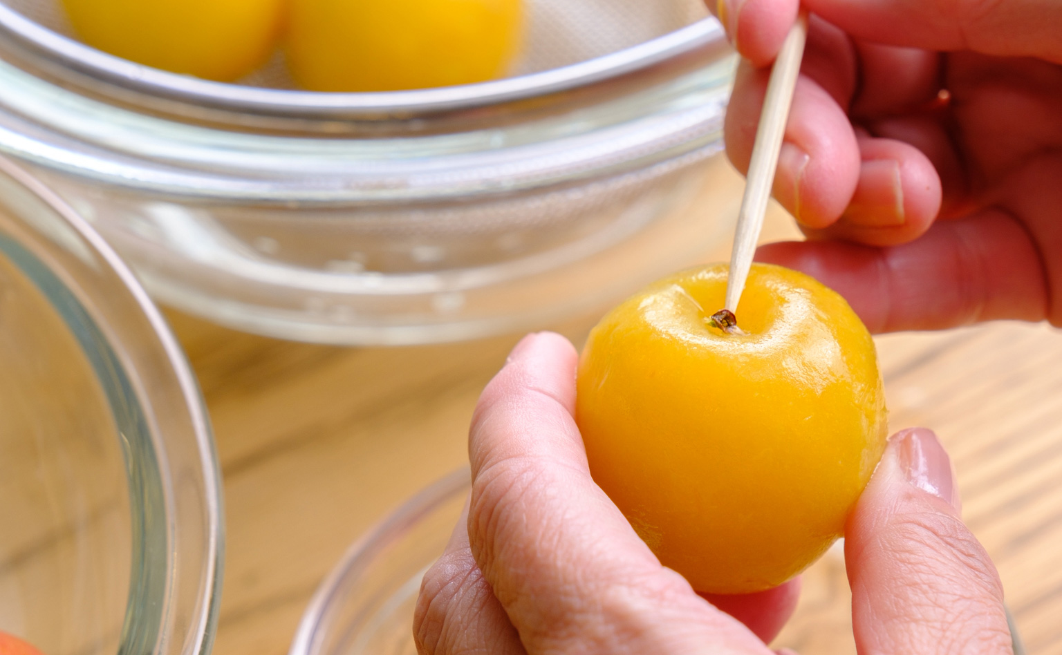 【2】梅のヘタの部分を竹串などで取る。ヘタ部分と周りをホワイトリカーに軽くくぐらせる。
