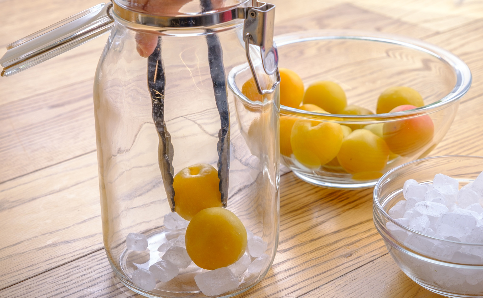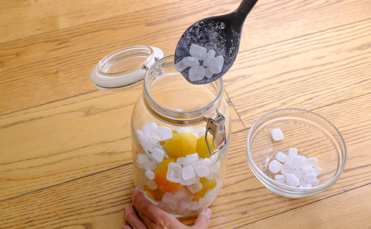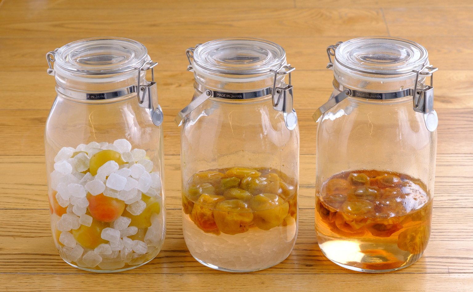 一日一度は漬け込んだガラス瓶を振って 梅全体に砂糖を行きわたらせる必要があるので、材料の1.5倍~2倍程度のサイズを選んでください。完成するまでは冷暗所に、完成後は梅を取り出して冷蔵庫で保存します。小さな保存容器に移せば場所を取らずにすみますよ。