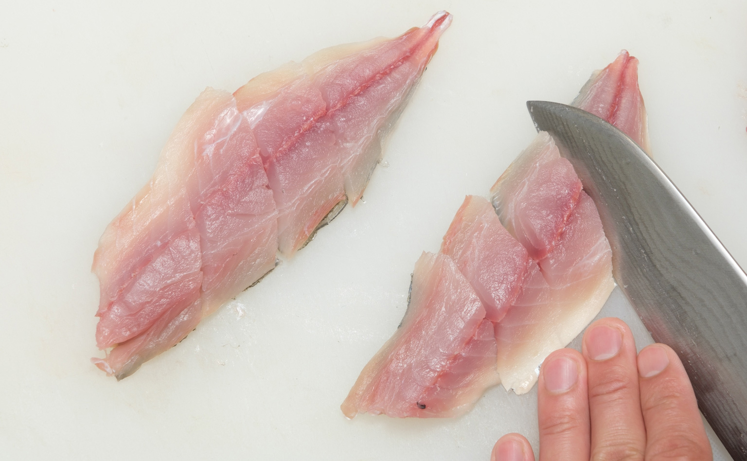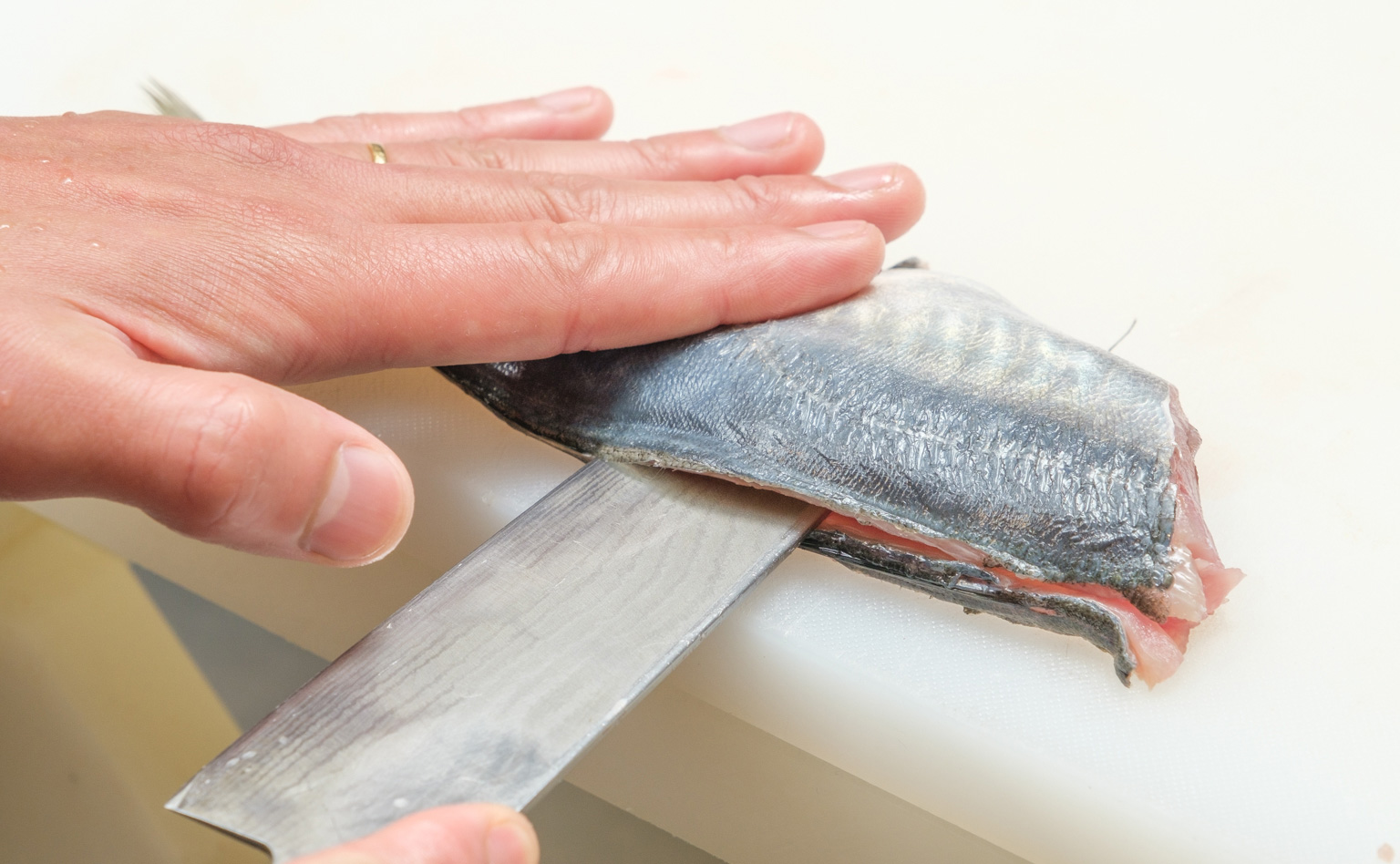 スズキやタイなどは大きいので、大名おろしにすると骨に残る身の量も多いんですよね。なのでアジやイワシ、コハダなど、小さい魚をおろす時に使われることが多いです。魚を初めておろす人だったら、アジやイワシなどが取り組みやすいと思いますよ。包丁は一般的な三徳包丁で構いません。