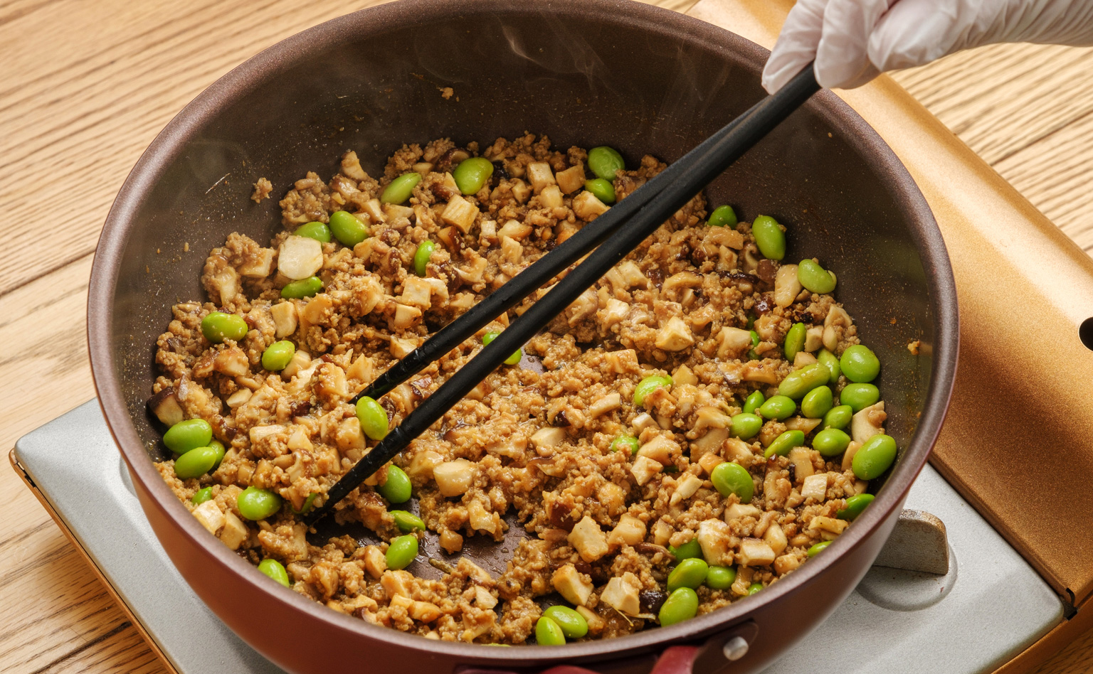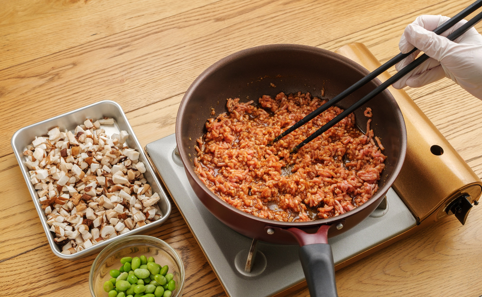 【2】豚ひき肉の赤みが少し残っている状態になったら【B】を加えて混ぜ、汁気がなくなるまで肉がダマにならないように混ぜながら7分程度煮詰める。汁気がほとんどなくなってきたら、こめ油を回しかける。焦がさないように菜箸で混ぜながら、3分程度そぼろ状になるまで加熱し、火を止める。粗熱が取れたら保存容器に移し、よく冷ます。