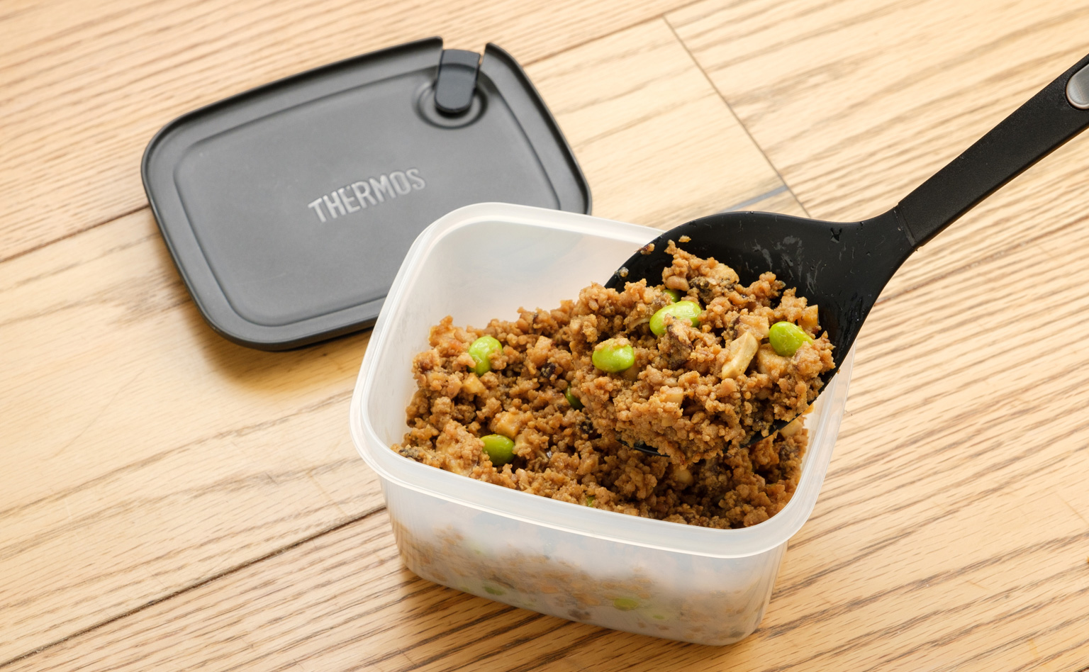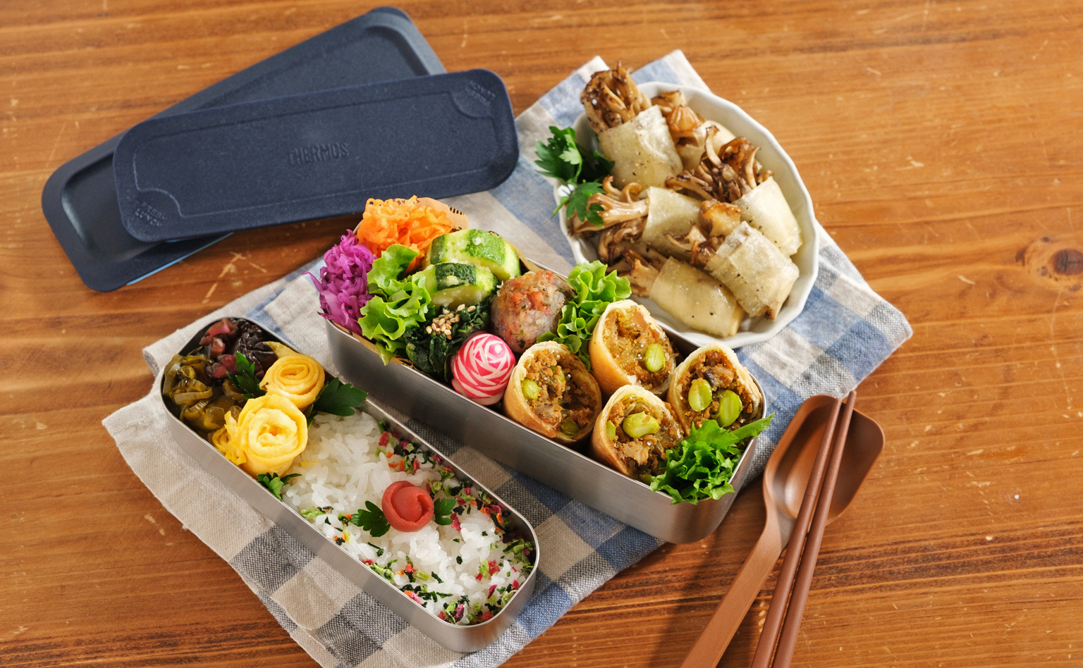 でも、カレー粉を使うときに気になるのは、他のおかずへの「色移り」や「におい移り」ではないでしょうか。プラスチック製の容器では洗っても色が残ってしまうので、ステンレス製がおすすめです。そこで今回は、サーモスの2段式お弁当箱「フレッシュランチボックス」(635ml)を使用します。あわせてご紹介するのは、春巻きの皮で具を包むレシピ! カレーの香りが広がりすぎないので、他のおかずと一緒に盛り付けても大丈夫。ぜひ作ってみてくださいね。