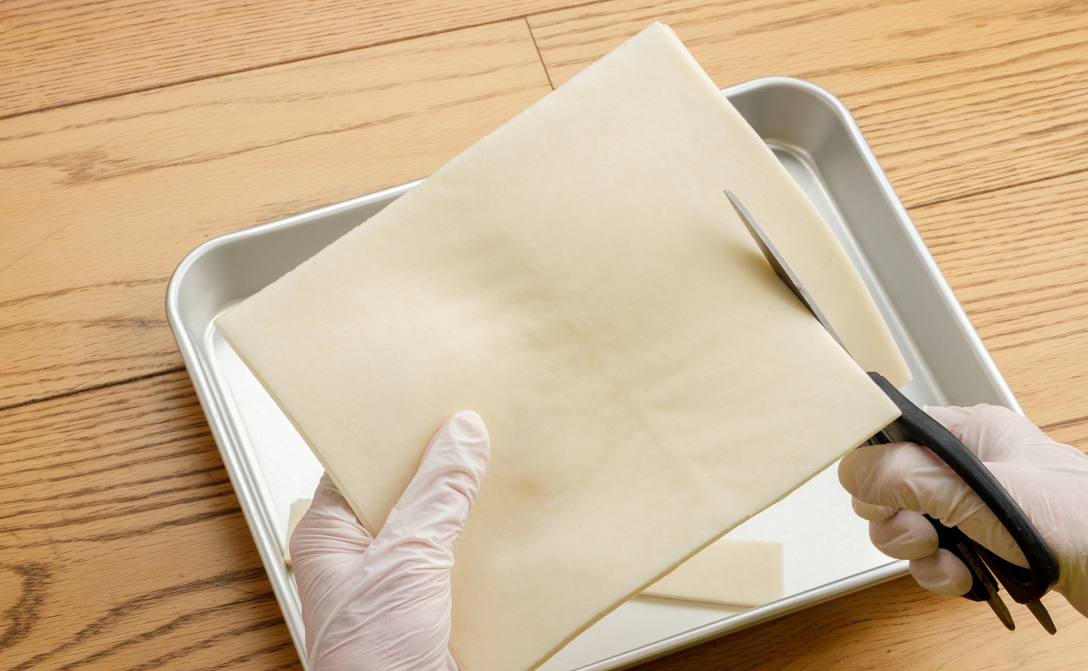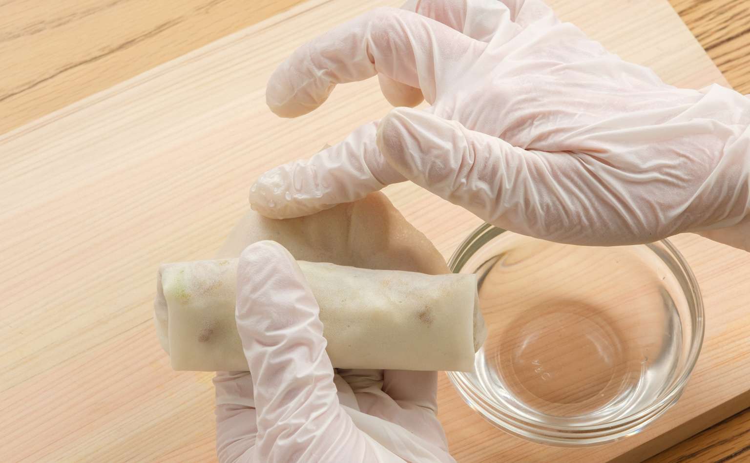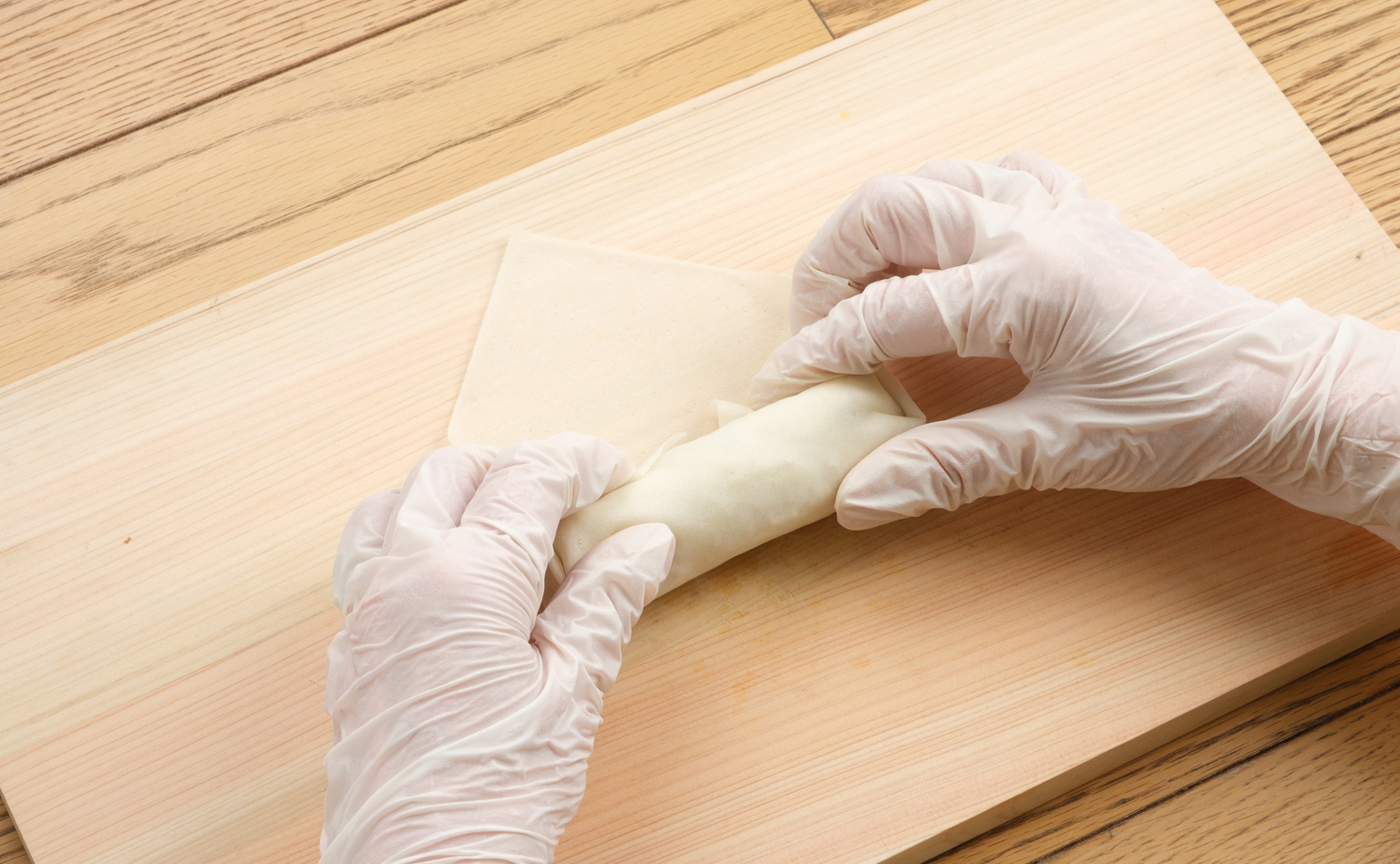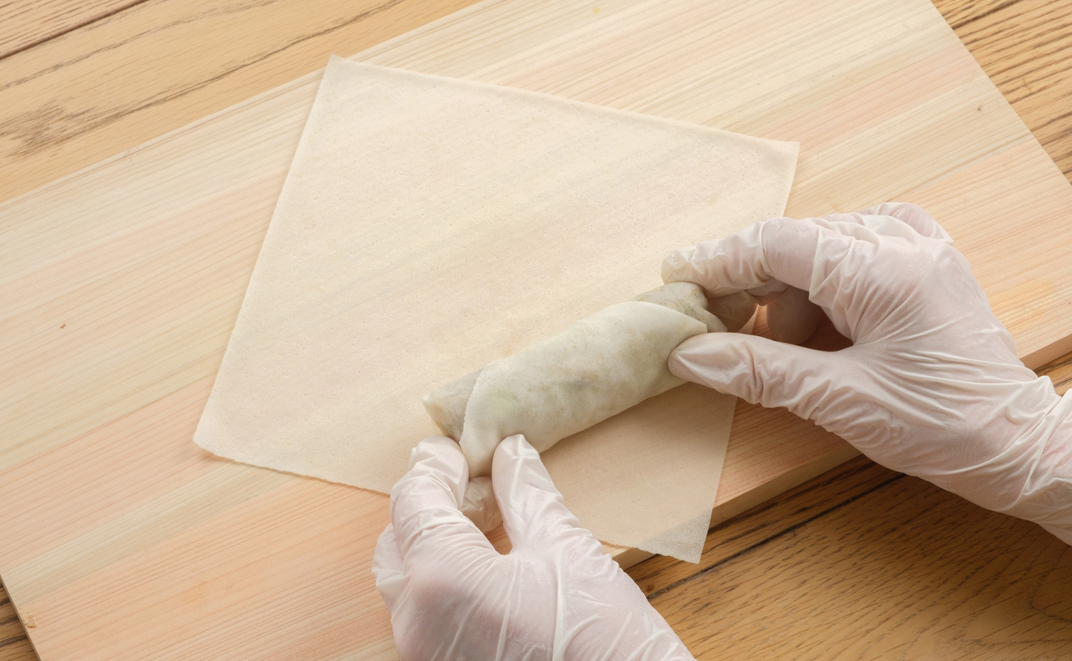 【6】巻き終わりを下にして、もう一重春巻きの皮でふんわりと包む。