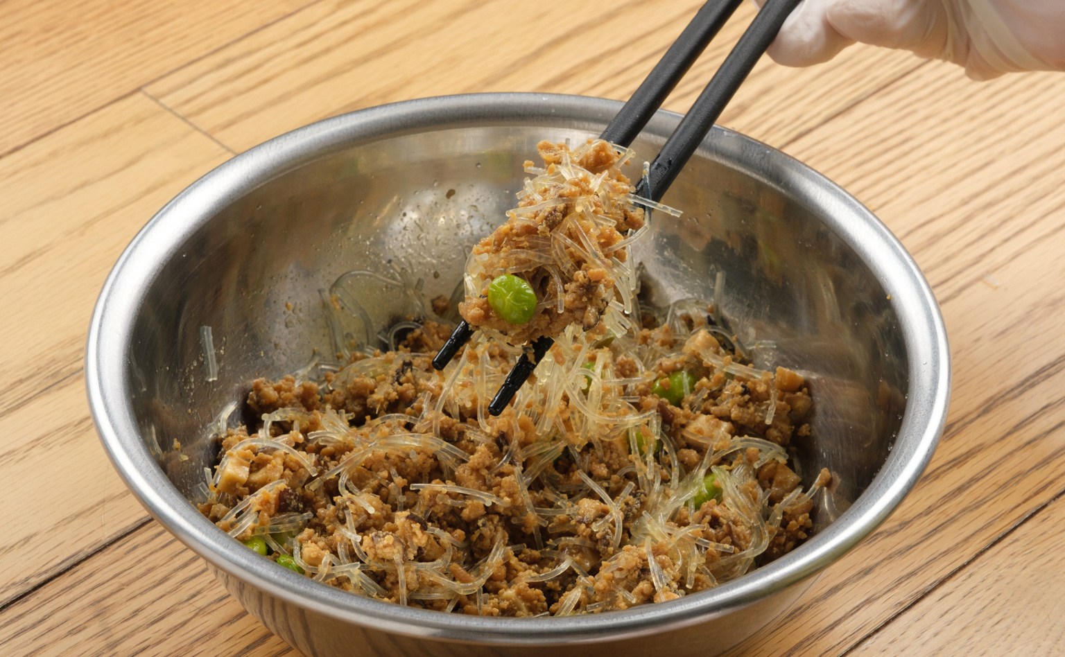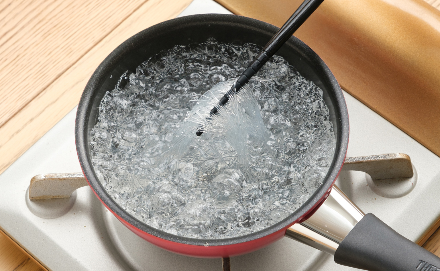 【4】鍋に湯を沸かし、春雨を2分程度ゆでる。 ザルにあげて水気を切ったら、3cm位にカットする。ボウルに取っておいたカレーそぼろに春雨を入れて混ぜる。