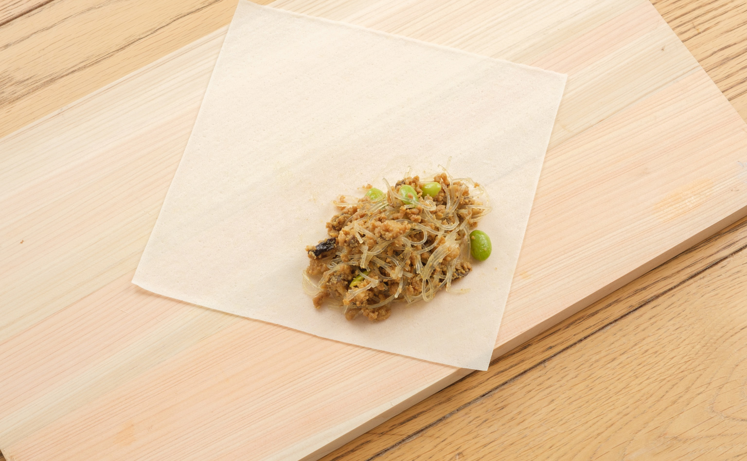 【3】【2】のカレーそぼろのうち、170gをボウルに用意する。春巻きの皮を17cm四方に切る。