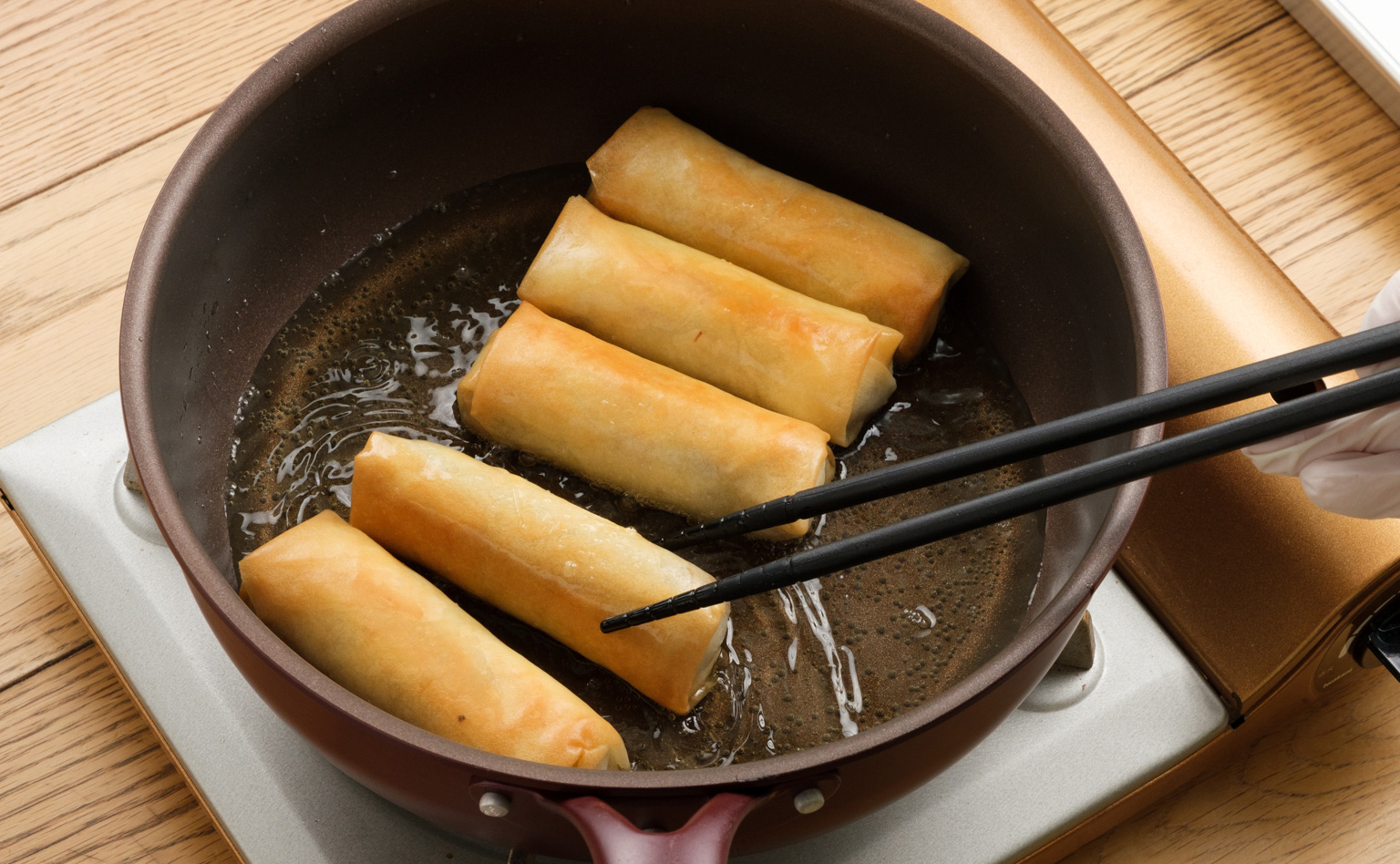 【7】フライパンにこめ油を底から1cm位入れたら、火にかけて、180℃に熱する。全面がきつね色になるまで4分程度揚げ焼きする。