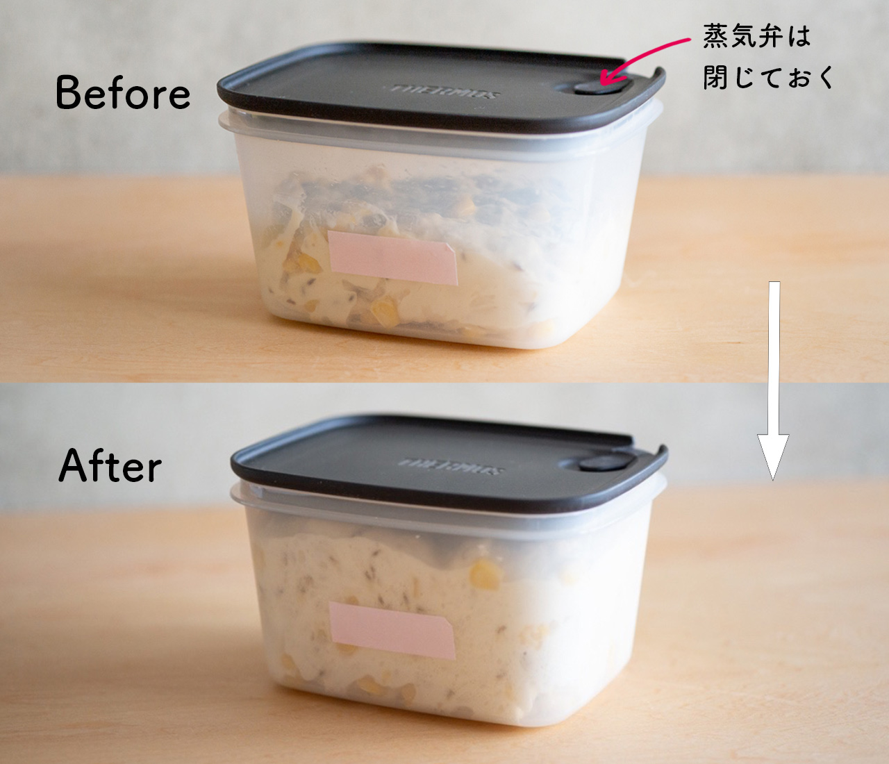 ▲サーモスのMyフードコンテナー800mlを使用。今回のレシピの分量は、このサイズで作るのに適した量