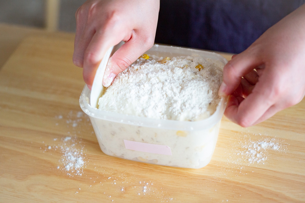 実は、最小限の工程かつ、発酵器がなくても、おうちで本格的なパン作りができるんです。今回お教えする「切りっぱなしパン」は、生地をたくさんこねる必要がなく、発酵もプラスチックの保存容器に入れて生地が2倍に膨らむまで常温で置いておけばOK。