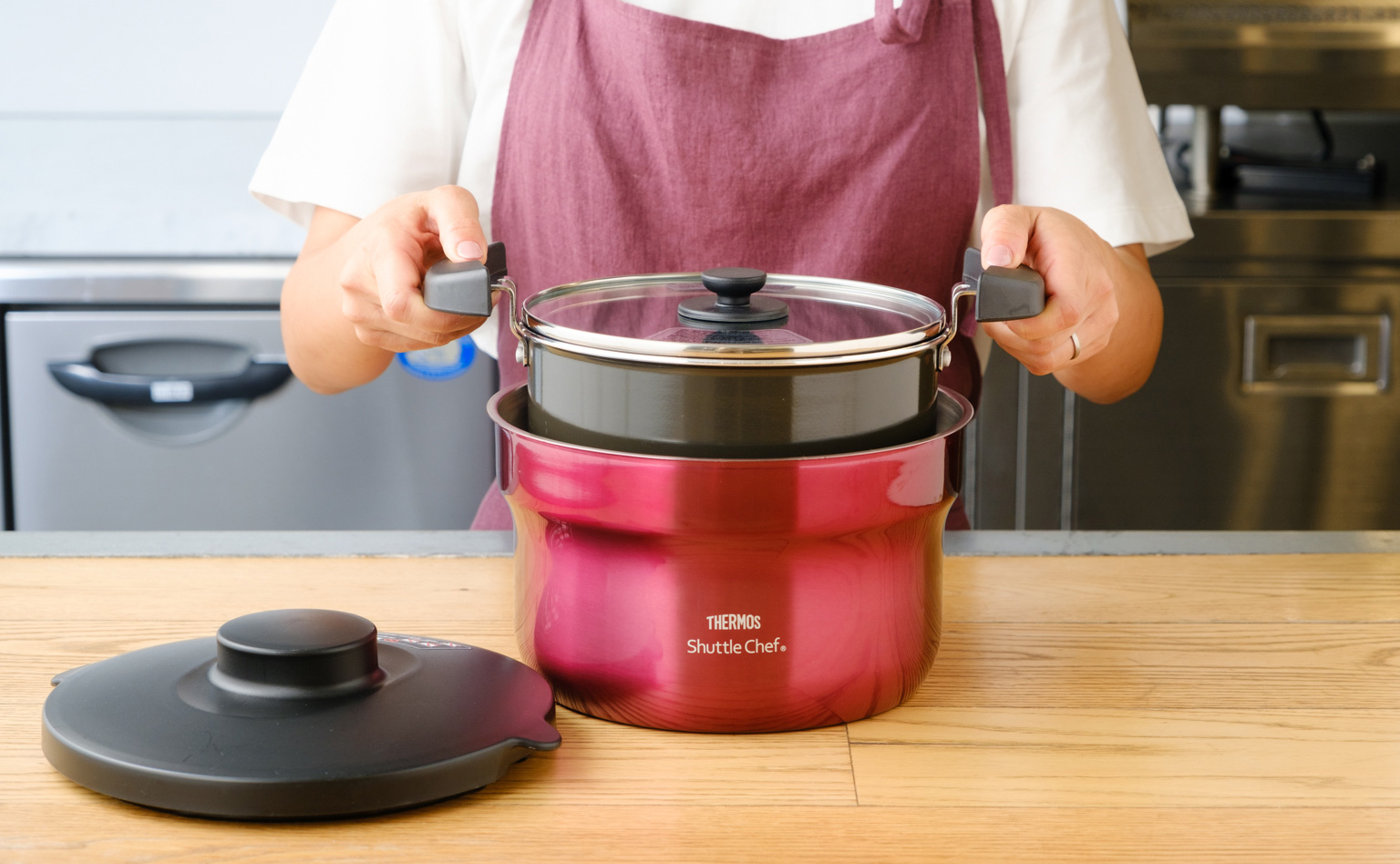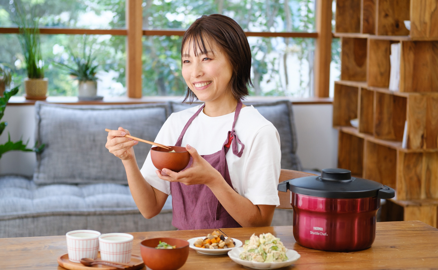 短時間加熱した鍋を保温容器に入れ、余熱の力で食材に火を通す「真空保温調理器シャトルシェフ」。スープや煮込み料理だけではなく、他にも色々な料理に活用できるんです。「ほぼ毎日使っています!」と話す料理家・神社あゆさんに、実際に普段からしているという3つの使い方を再現していただきました!