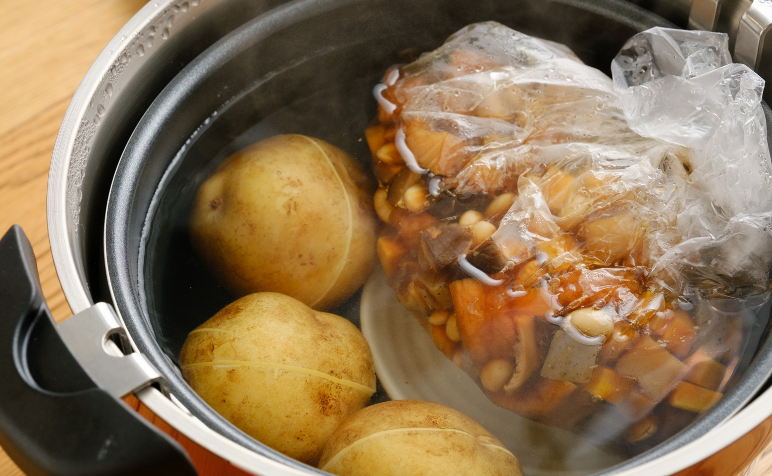 お湯の中に食材を入れ、再沸とう後に弱火で5分ほど加熱したら、後は保温容器で40~50分程度。時間を置くほど味がしみるので、シャトルシェフでの調理にぴったりなんです。 じゃがいもにはぐるりと1周浅い切り込みを入れておくと、粗熱を取った後に皮がむきやすくなりますよ。