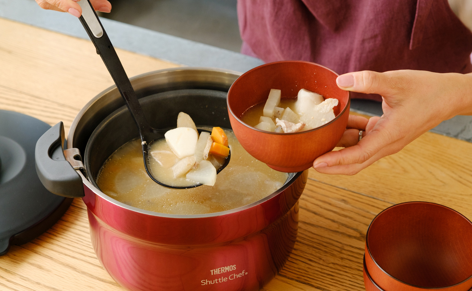 私がいつも家で作る時は、調理鍋での加熱時間は約10分、味噌を溶かし入れたら2時間程度保温します。夜ご飯にしたい時間を逆算して取り掛かるようにしていますね。シャトルシェフは保温力が高いので、習い事で後から食べる長男や仕事で遅くなる夫にも、温め直しせず出せることが多いんです。