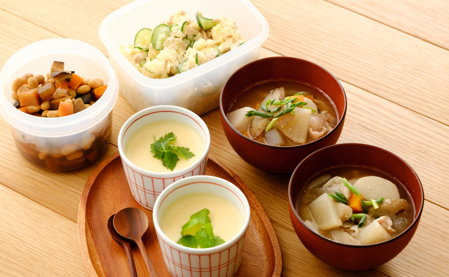 時間のかかる野菜の下茹でなどを、同時調理で済ませておくと便利です。五目豆は冷蔵庫で5日ほど保存できるので、作り置きにもおすすめです。他にも、低温調理で「サラダチキン」と「温泉卵」なども一度に作れますよ。
