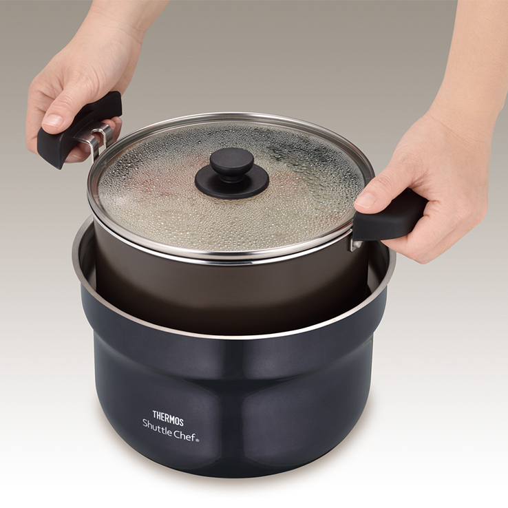 シャトルシェフは、短時間火にかけた調理鍋を、真空断熱構造の保温容器で丸ごと保温し、余熱で食材に火を通す『保温調理』ができる調理器具です。保温調理中は火を使わないのでコンロにつきっきりの必要がありません。