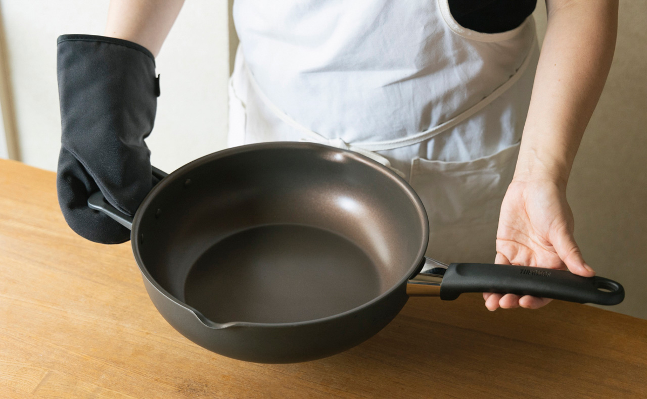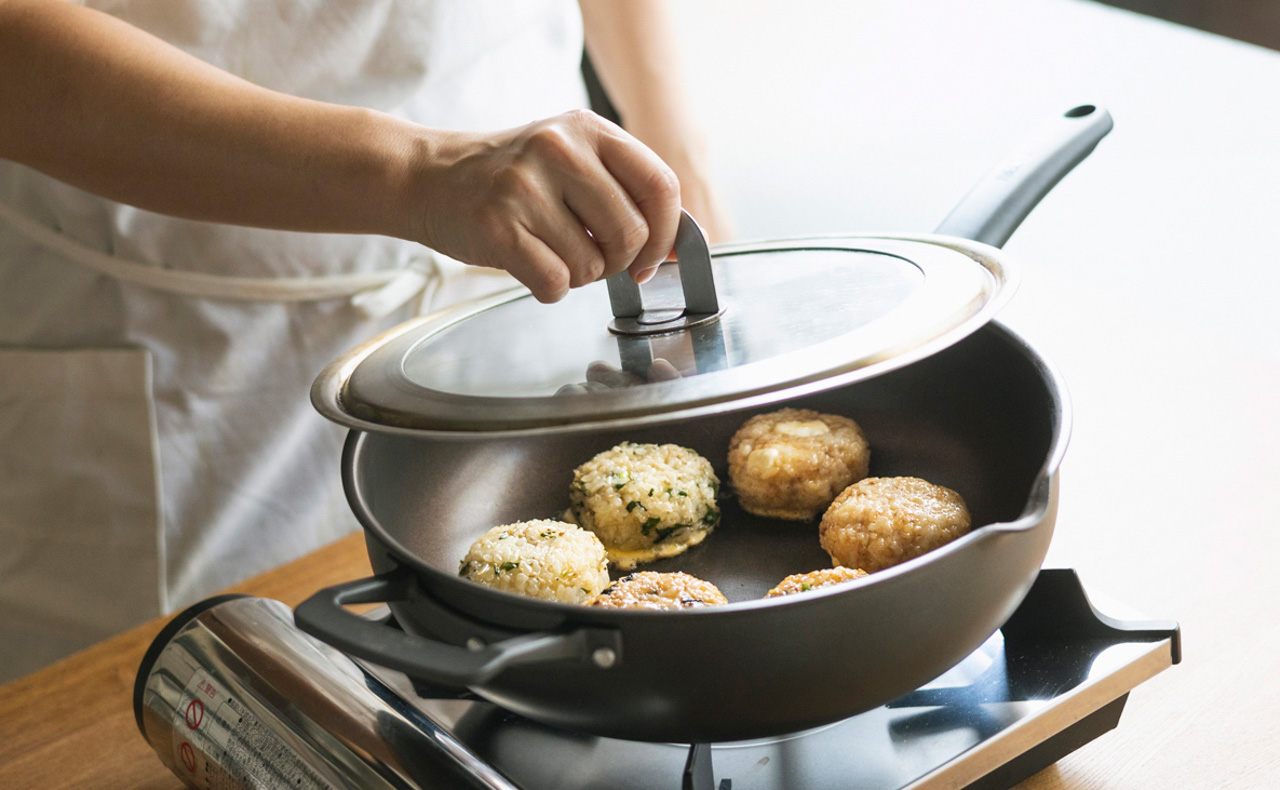 語り出したら止まらない、サーモスのフライパン愛。そんなのりこさんに、補助取っ手・注ぎ口付き、超深型タイプの「マルチパン(KFKシリーズ)」で作っていただくのが、「おにぎりピカタ」。