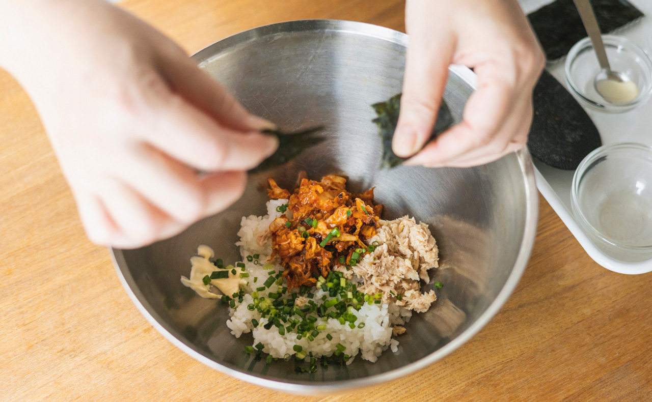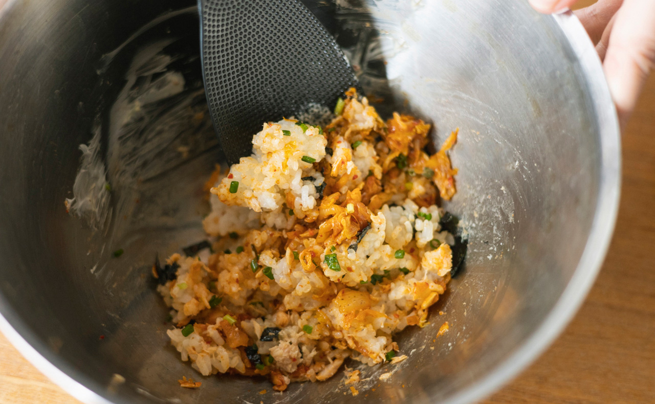 3. ごはんにツナ、キムチ、ごま油、マヨネーズ、万能ネギ、韓国海苔をちぎって混ぜ、2等分して平たく丸める。