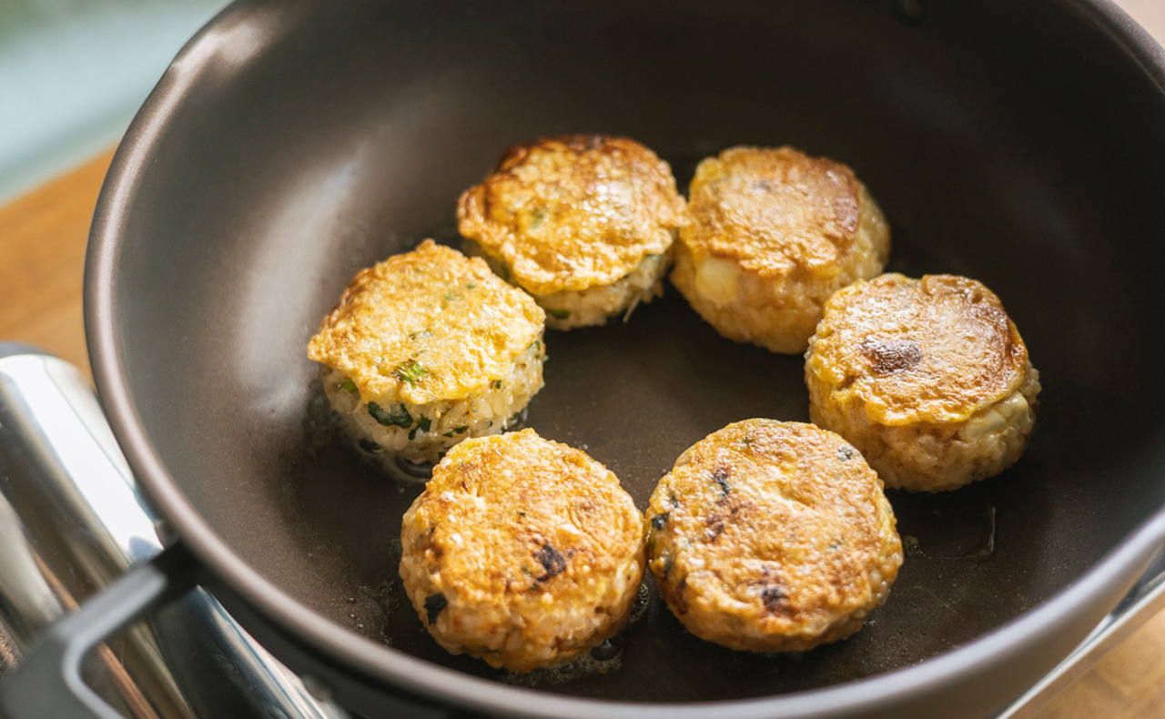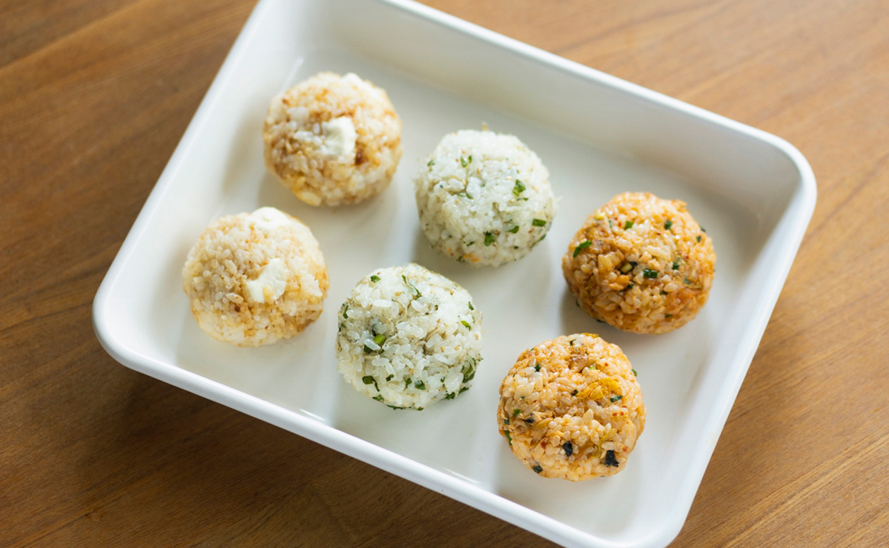 混ぜごはんに溶き卵をまとわせて焼く「おにぎりピカタ」。一口食べたらやみつきの新感覚の焼きおにぎりです。「おかか×クリームチーズ」「香菜×ちりめんじゃこ×ナンプラー」「チュモッパ風(韓国おにぎり)」の3種類のレシピを、料理家のごはん同盟・しらいのりこさんに教えていただきました。