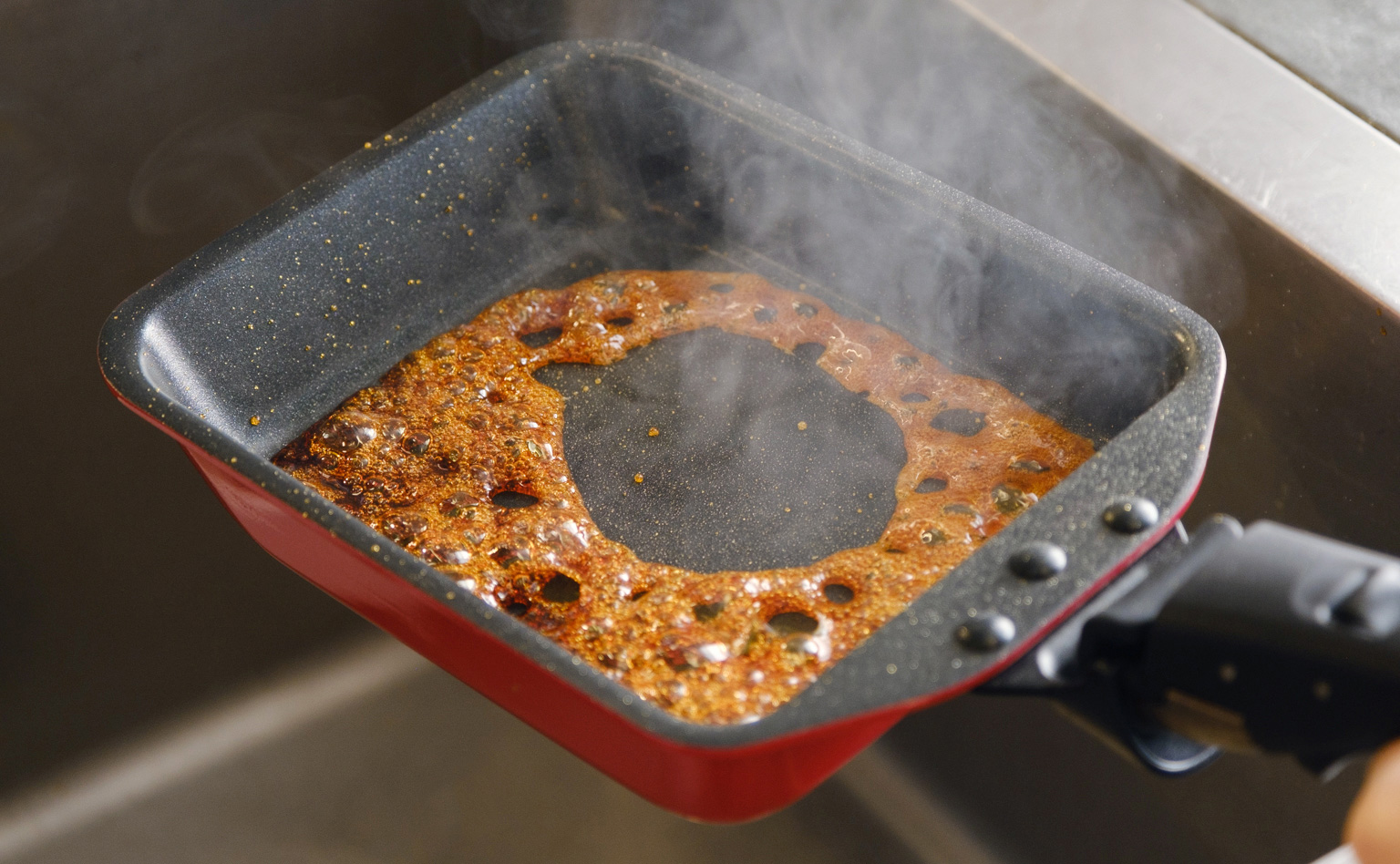 混ぜすぎると砂糖が結晶化してしまうので、フライパンを時々ゆっくり回す程度でOKです。お湯を加えるときはハネやすいので、シンクの上などで作業しましょう。