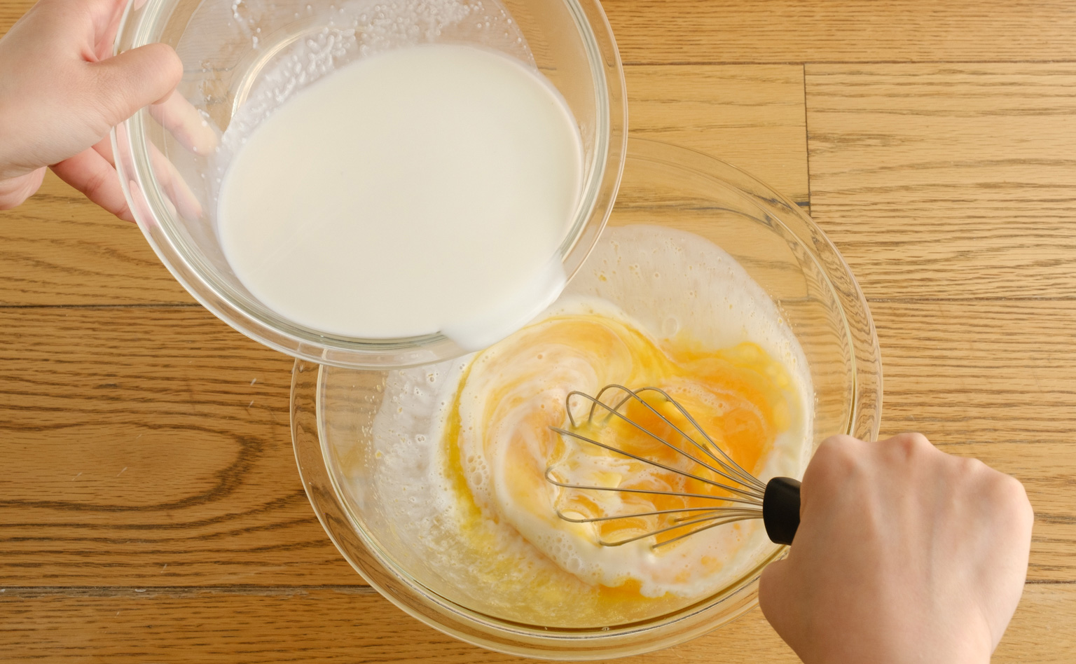 おたまを使い、何度かに分けてゆっくり注ぎましょう。カラメルと卵液が混ざりにくくなるだけでなく、表面に気泡もできにくくなります。