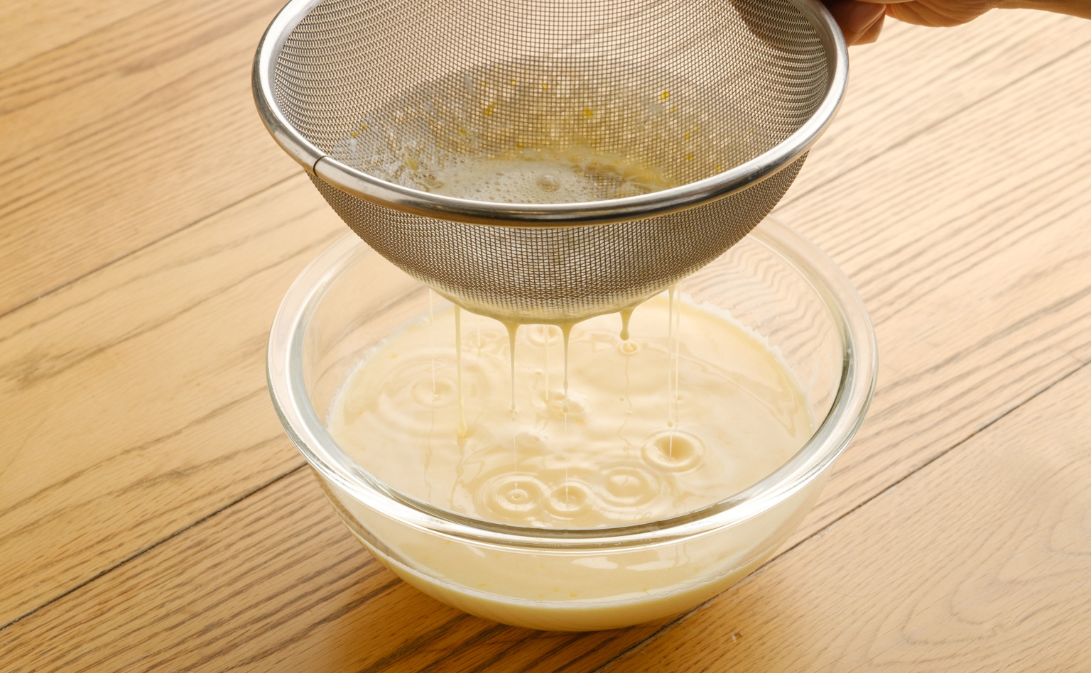 卵は泡立てず、白身をほぐすように混ぜるのがポイントです。最後にザルで濾すことで、滑らかな仕上がりになりますよ。